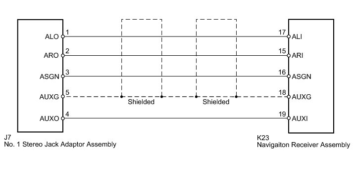 The No. 1 stereo jack adapter assembly sends an external device sound signal to the navigation receiver assembly through this circuit. The sound signal that has been sent is amplified by navigation receiver assembly, and then is sent to speakers.