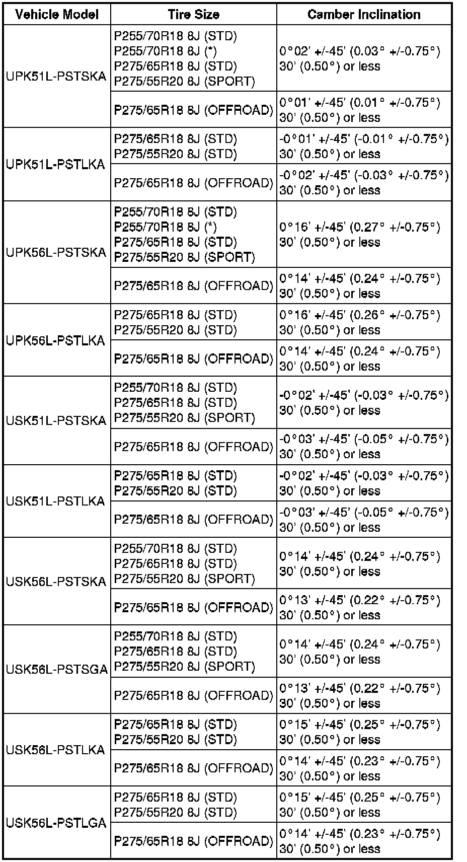 Standard Camber Inclination