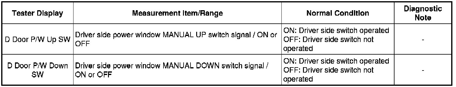 * If the manual UP/DOWN function does not operate, there may be a malfunction in the master switch, the driver side motor, or the harness or connector.