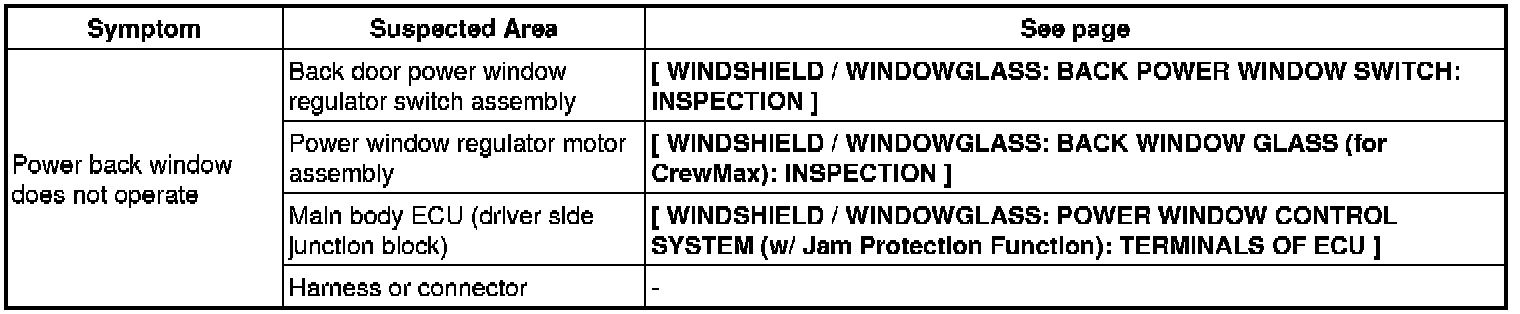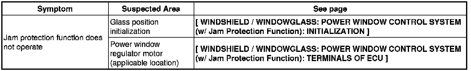 WINDSHIELD / WINDOWGLASS: POWER WINDOW CONTROL SYSTEM (w/ Jam Protection Function): PROBLEM SYMPTOMS TABLE