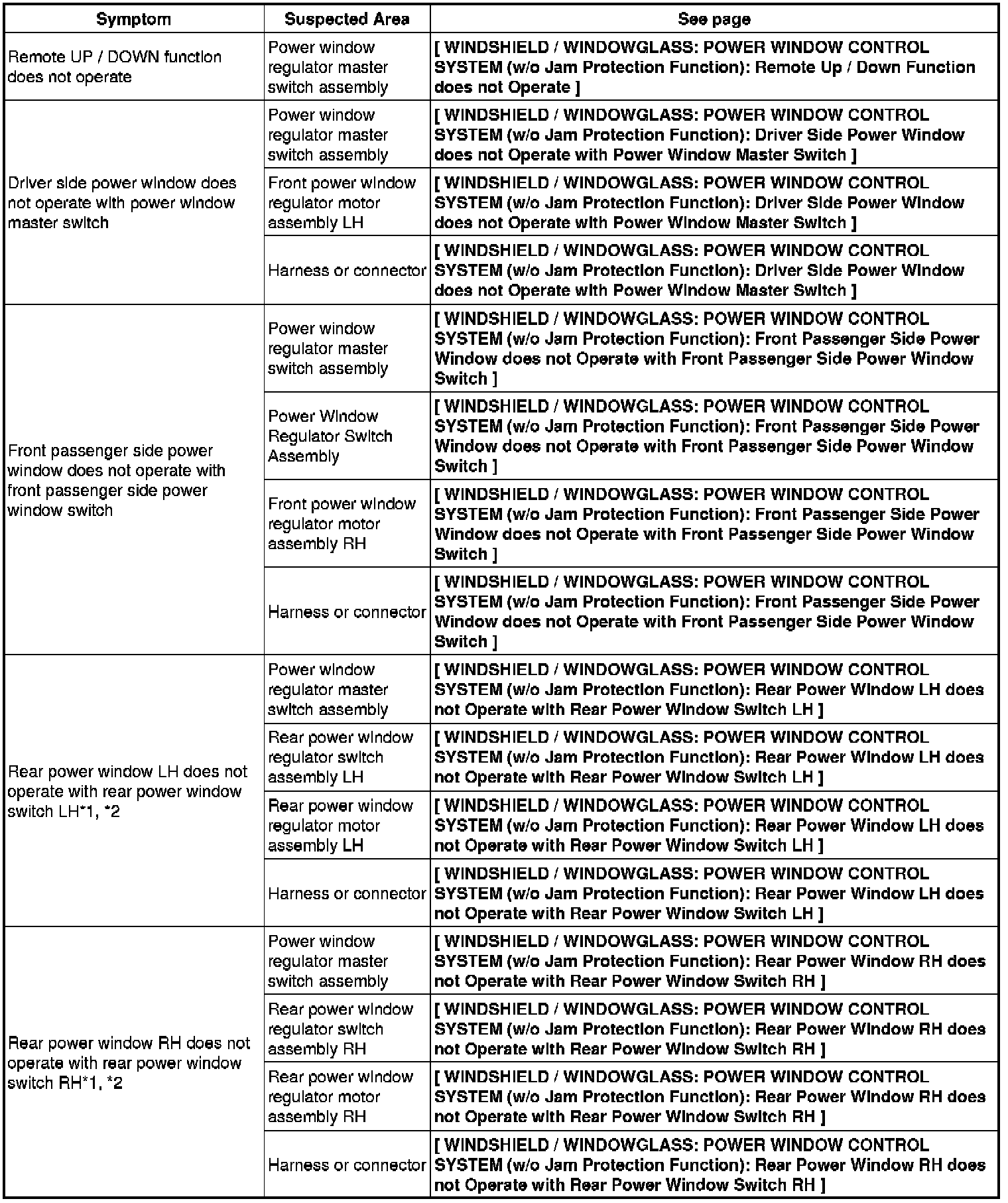 WINDSHIELD / WINDOWGLASS: POWER WINDOW CONTROL SYSTEM (w/o Jam Protection Function): PROBLEM SYMPTOMS TABLE