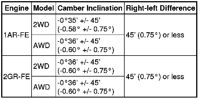 Check the combination of installed bolts. Select appropriate bolts from the table below to adjust the camber to the specified values.