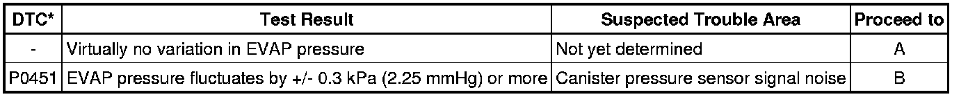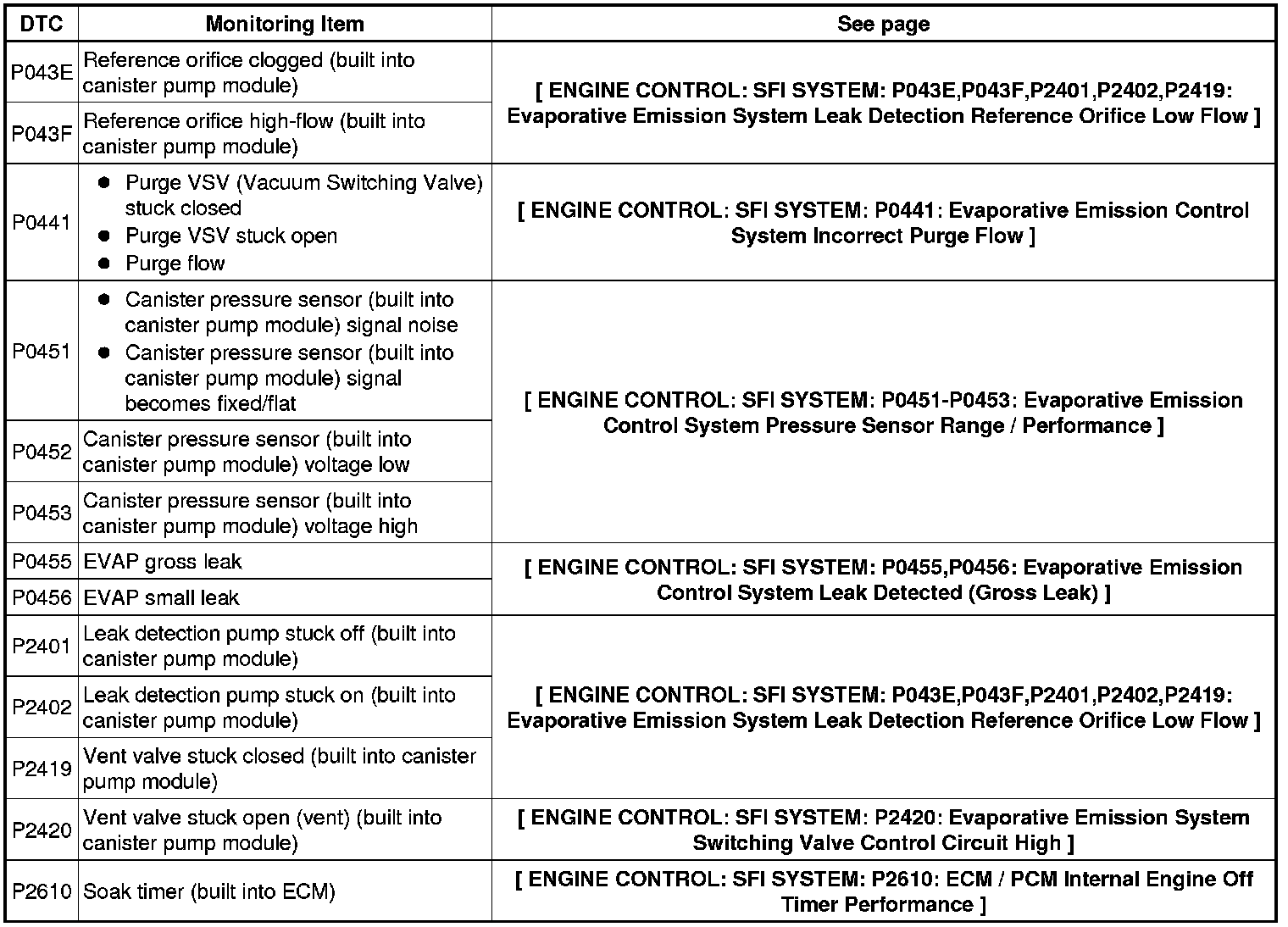 If any EVAP system DTCs are set, the malfunctioning area can be determined using the table below.