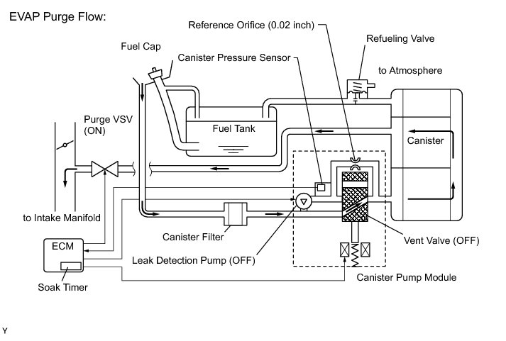 The purge flow volume is also determined by the intake manifold pressure. Atmospheric pressure is allowed into the canister through the vent valve to ensure that the purge flow is maintained when negative pressure (vacuum) is applied to the canister.