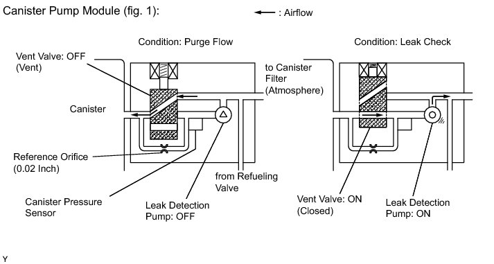 The leak detection pump creates negative pressure (vacuum) in the EVAP system and the pressure is measured. Finally, the ECM monitors for leaks from the EVAP system, and malfunctions in both the canister pump module and purge VSV based on the EVAP pressure.