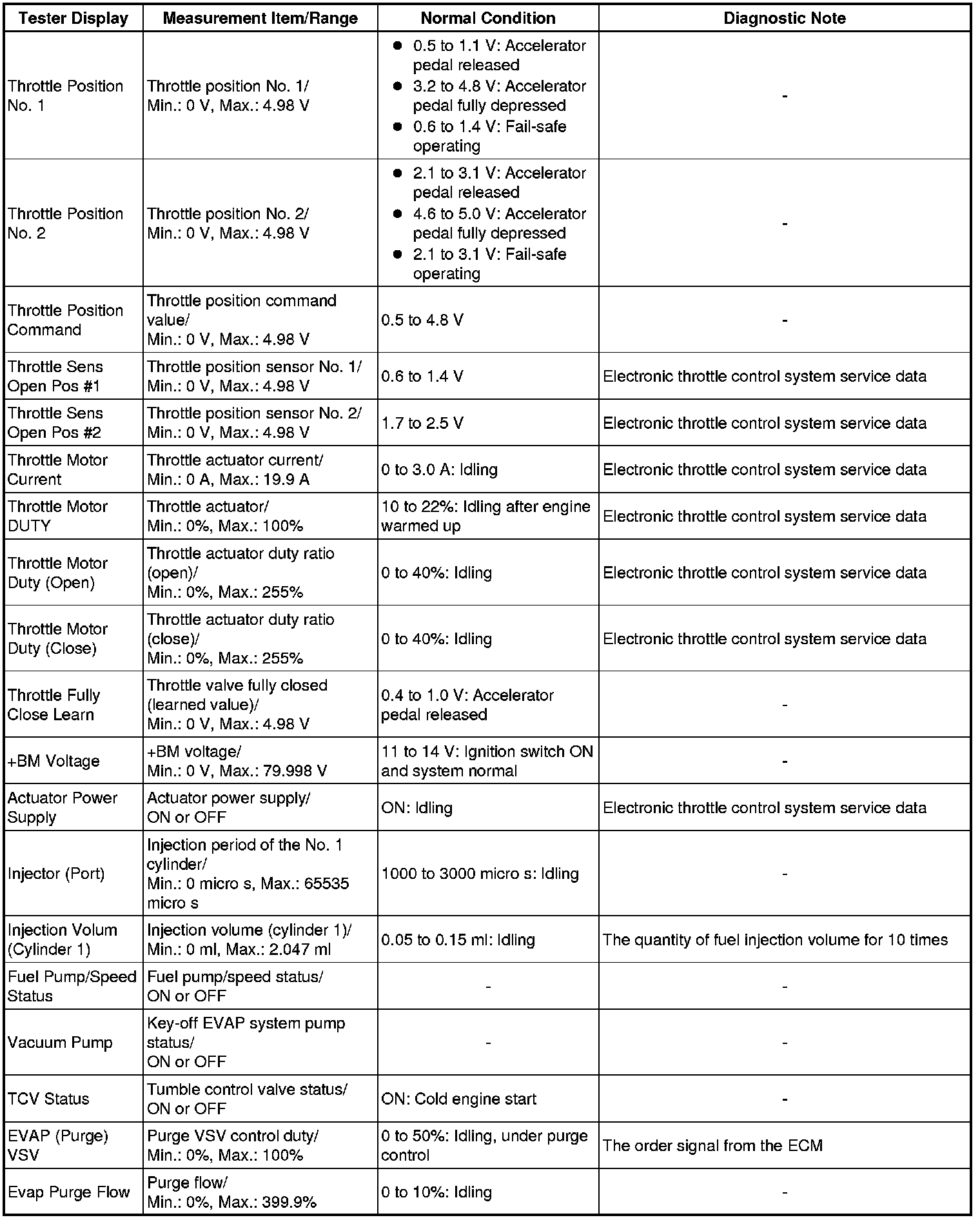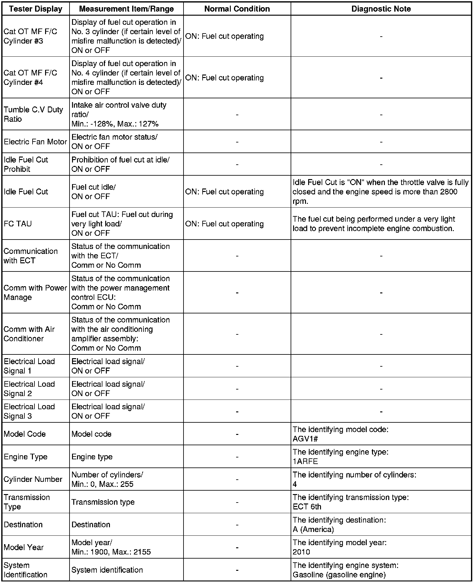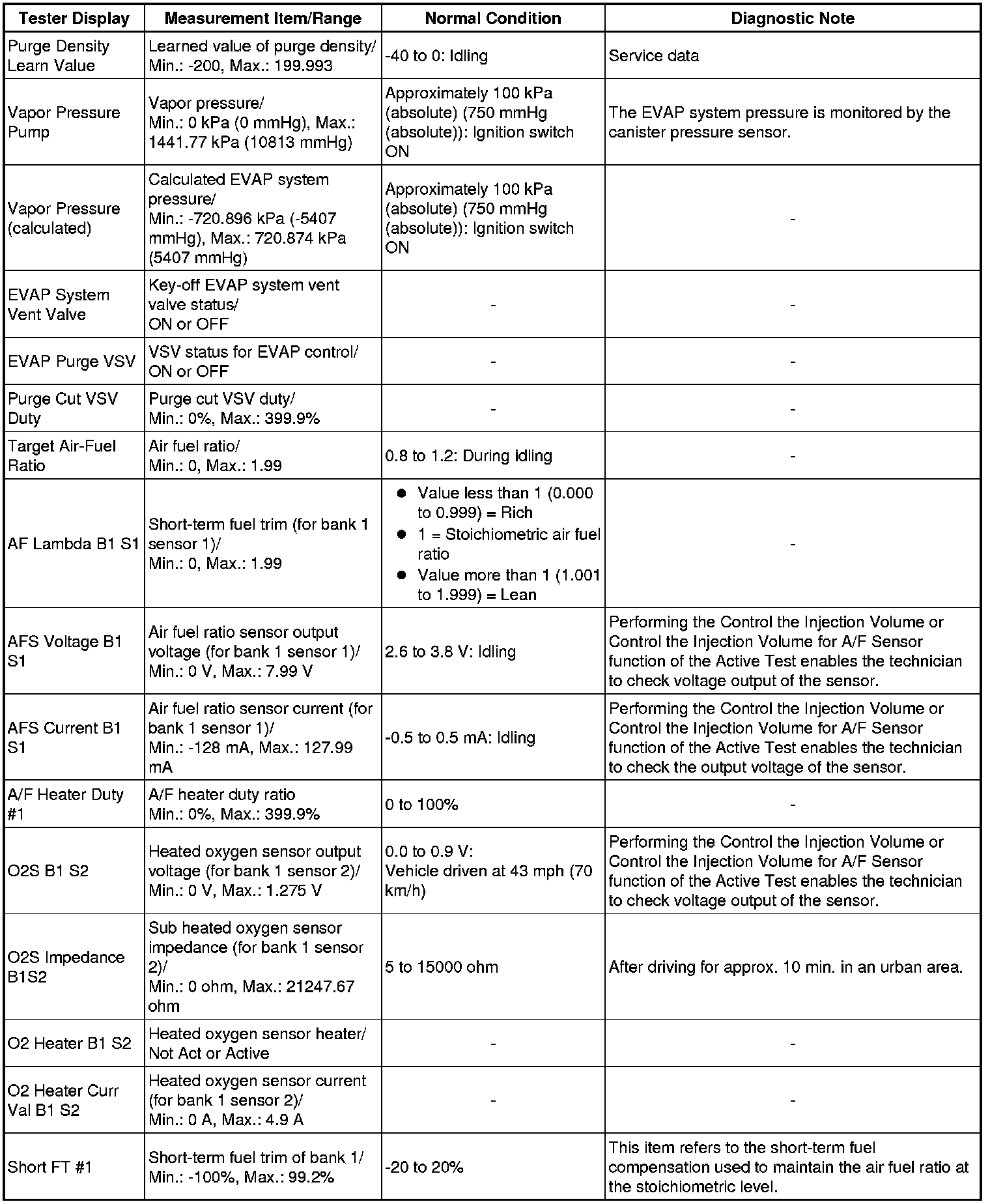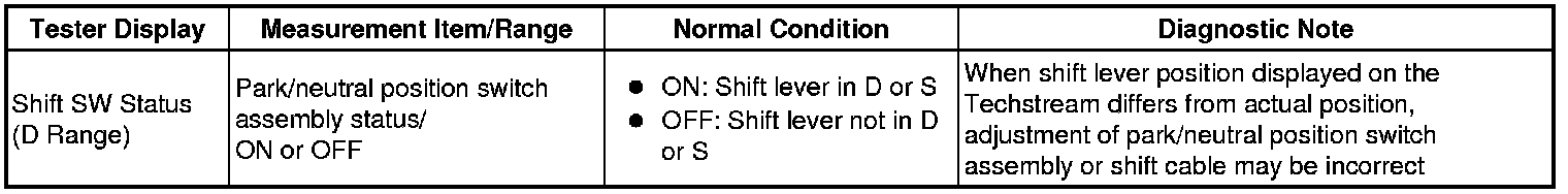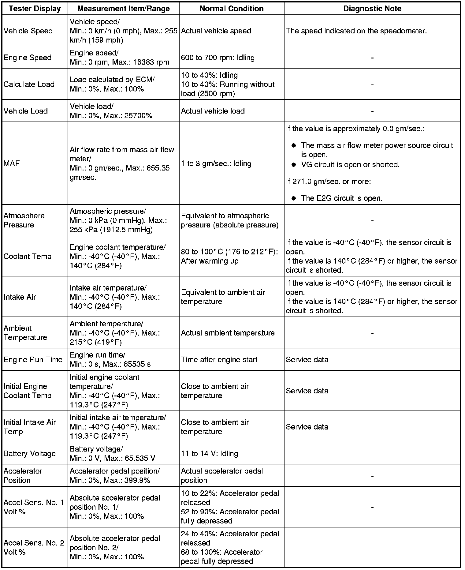 Using the Techstream to read the Data List allows the values or states of switches, sensors, actuators and other items to be read without removing any parts. This non-intrusive inspection can be very useful because intermittent conditions or signals may be discovered before parts or wiring is disturbed. Reading the Data List information early in troubleshooting is one way to save diagnostic time.