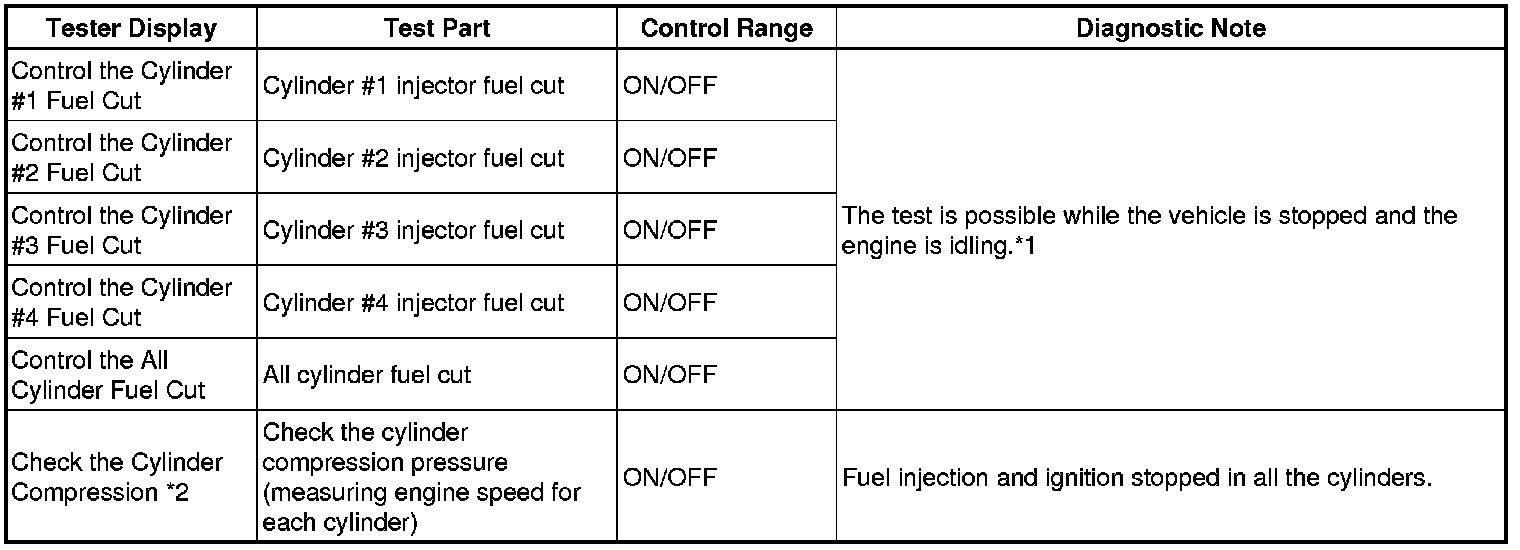 *2: While the Active Test item Check the Cylinder Compression is being performed, the fuel and ignition of all cylinders is cut. At this time, the ECM measures the speed of each cylinder while the engine is being cranked.
