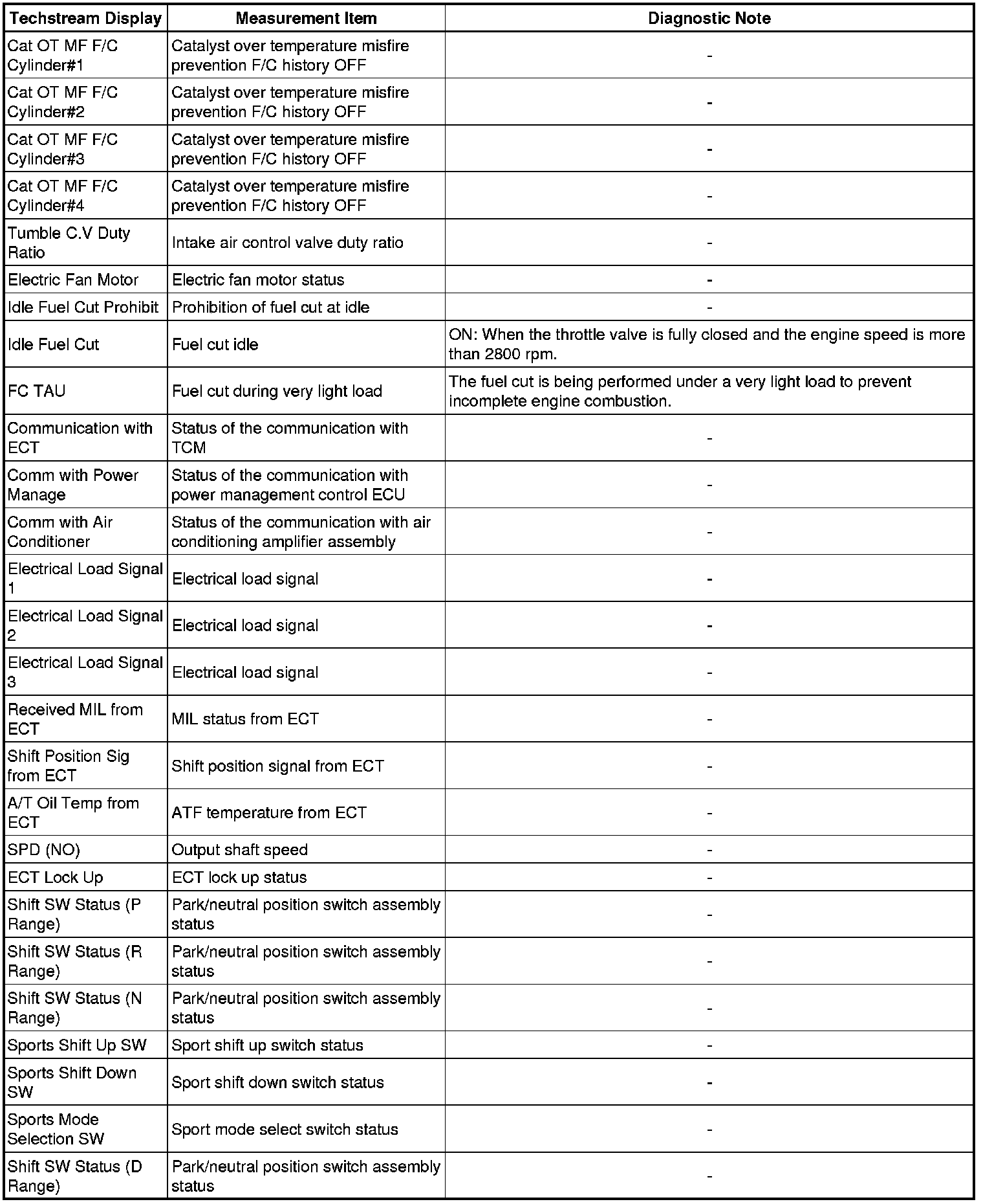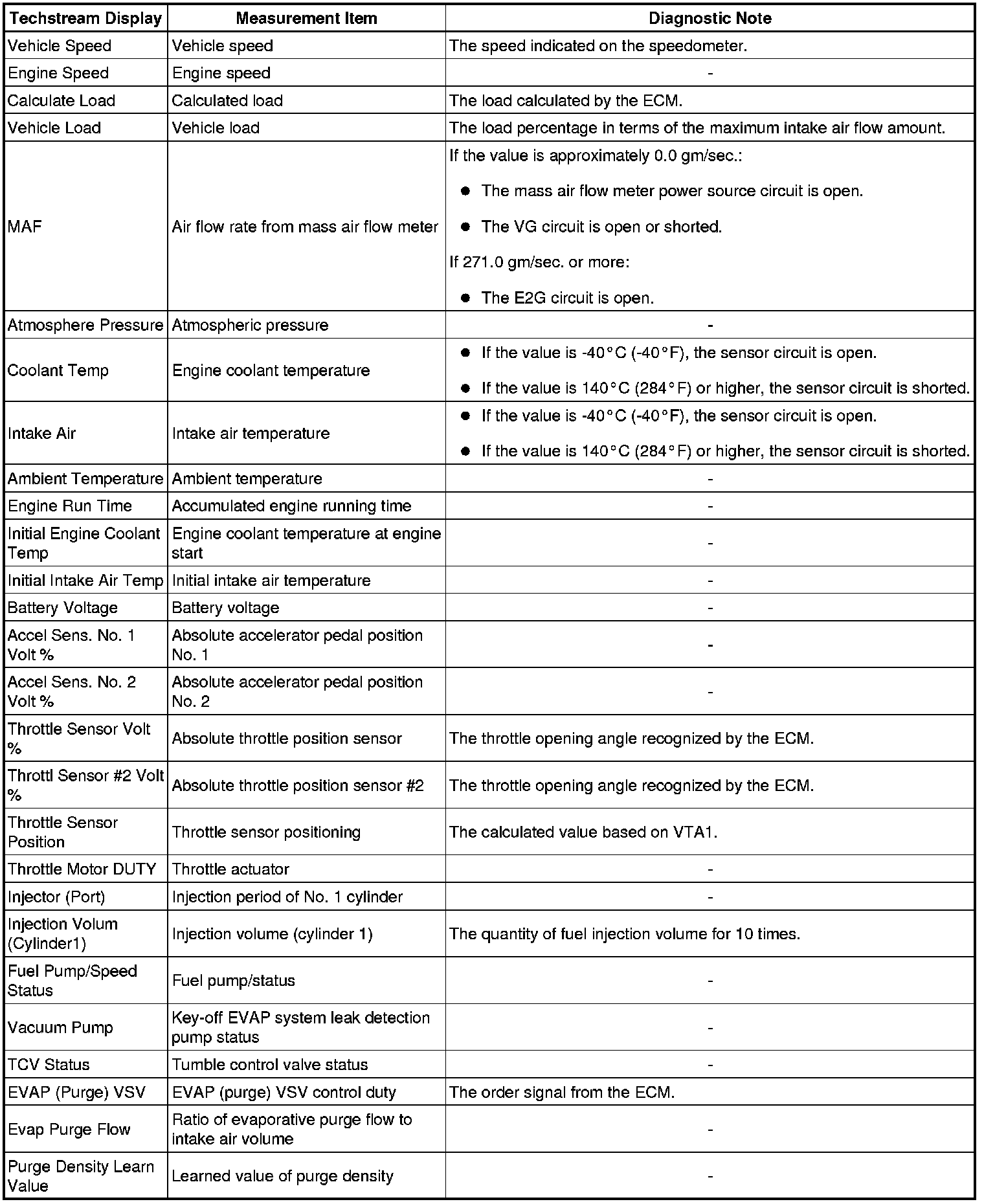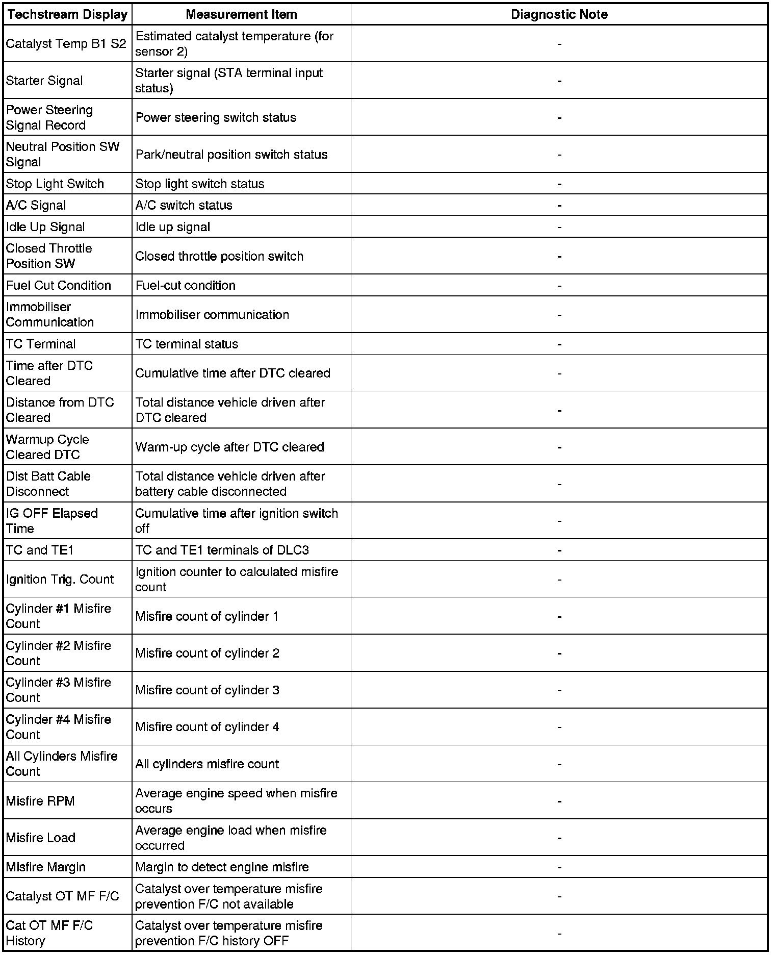 * The ECM records engine conditions in the form of freeze frame data every 0.5 seconds. Using the Techstream, 5 separate sets of freeze frame data, including the data values at the time when the DTC is stored, can be checked.