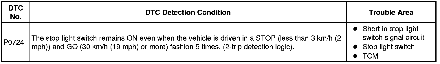 This DTC indicates that the stop light switch remains ON. When the stop light switch remains ON during "stop and go" driving, the TCM interprets this as a fault in the stop light switch, illuminates the MIL, and stores the DTC. The vehicle must stop (less than 3 km/h (2 mph)) and go (30 km/h (19 mph) or more) five times for two consecutive driving cycles in order to set this DTC.
