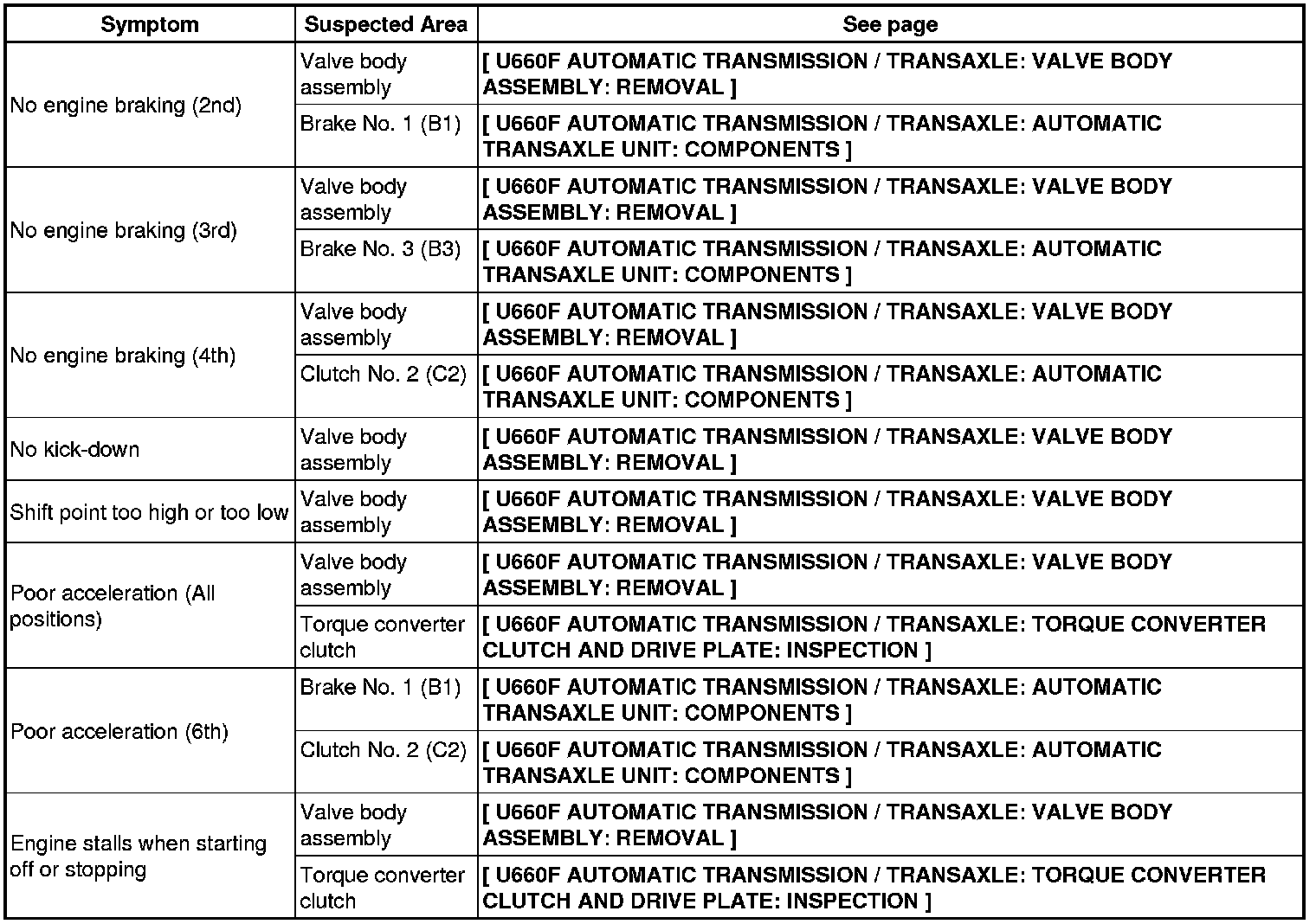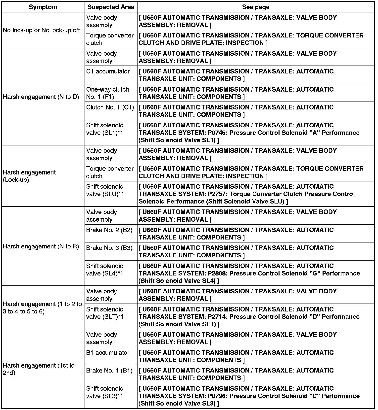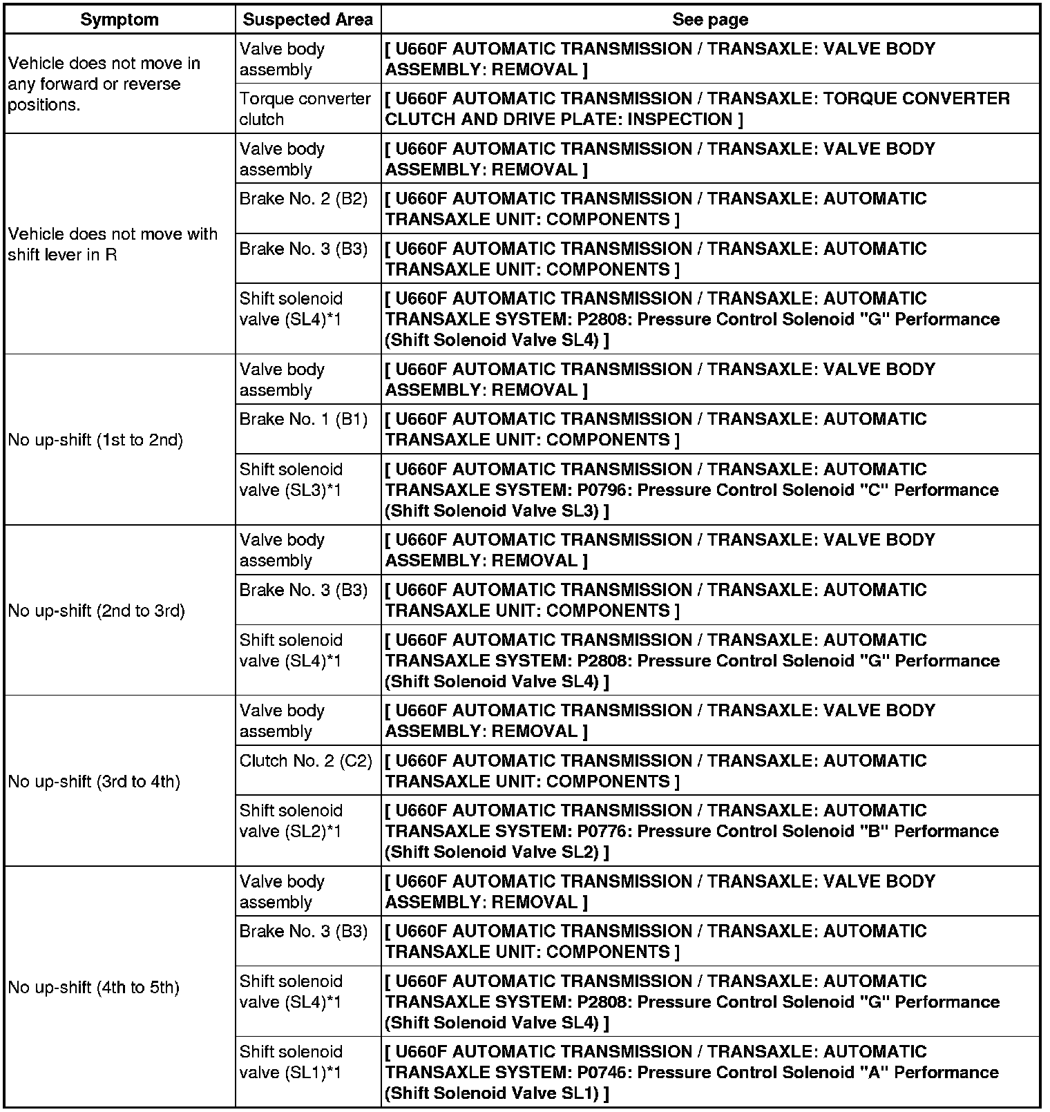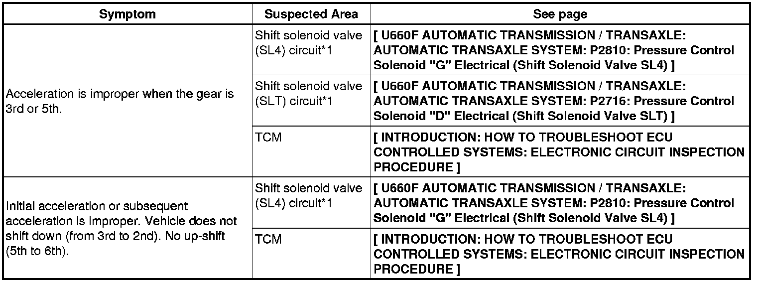 U660F AUTOMATIC TRANSMISSION / TRANSAXLE: AUTOMATIC TRANSAXLE SYSTEM: PROBLEM SYMPTOMS TABLE