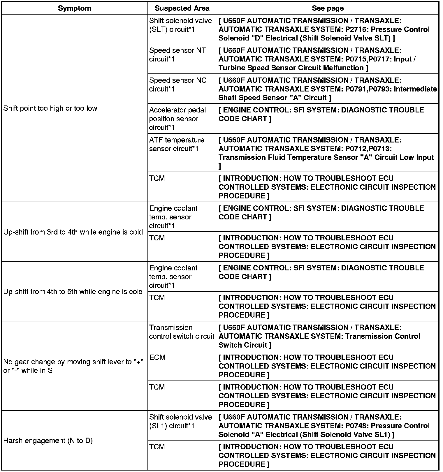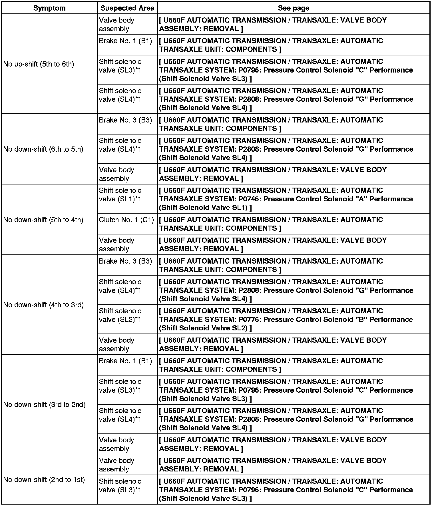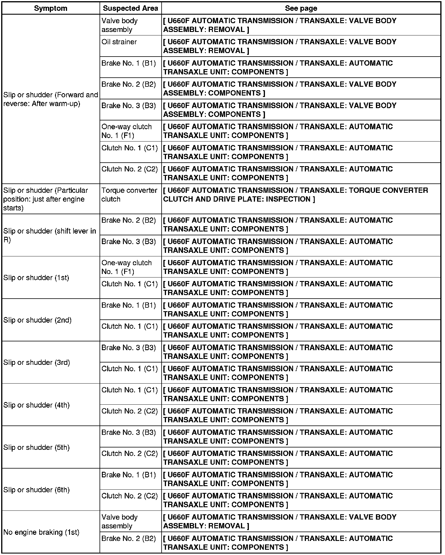 U660F AUTOMATIC TRANSMISSION / TRANSAXLE: AUTOMATIC TRANSAXLE SYSTEM: PROBLEM SYMPTOMS TABLE