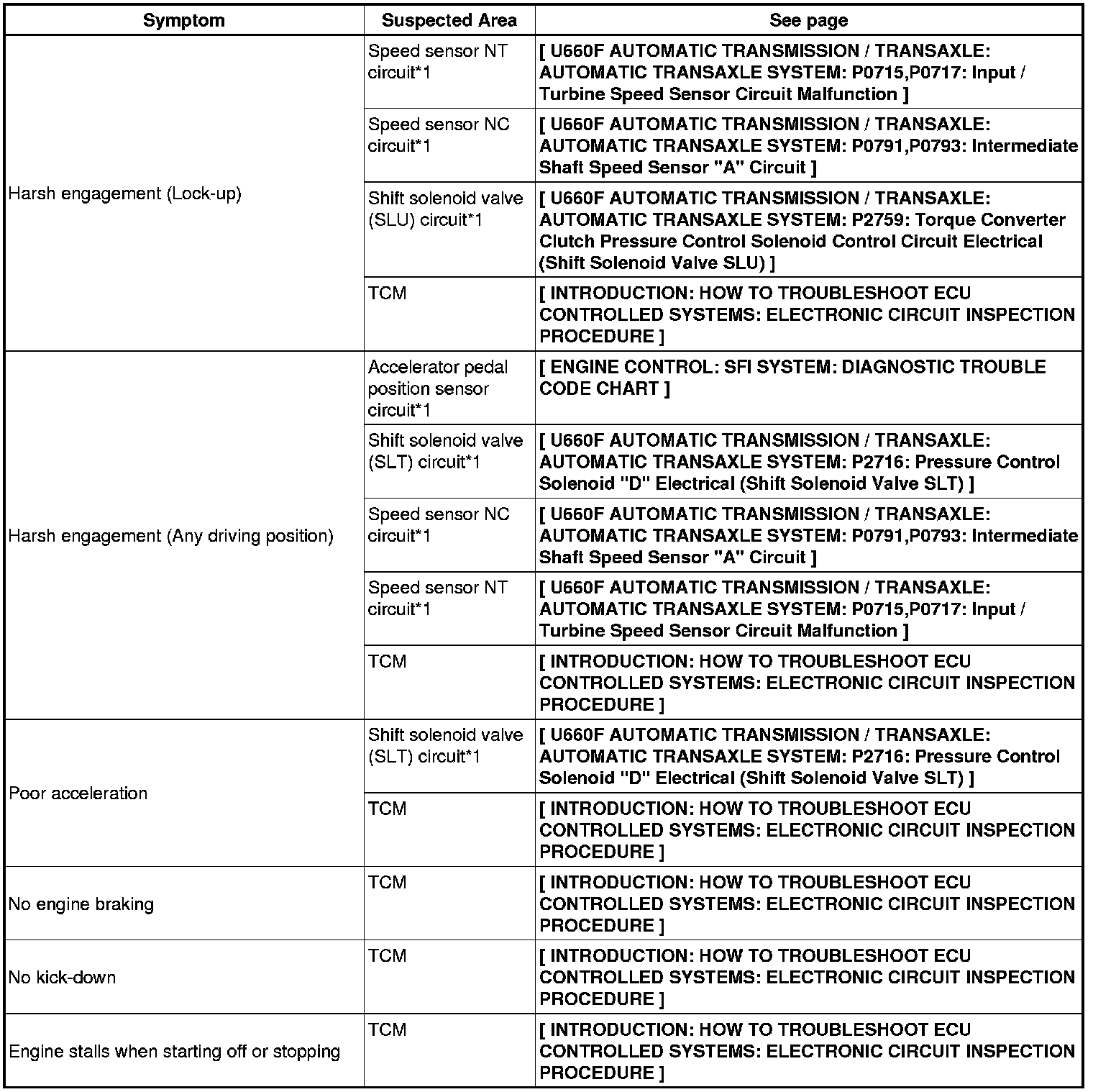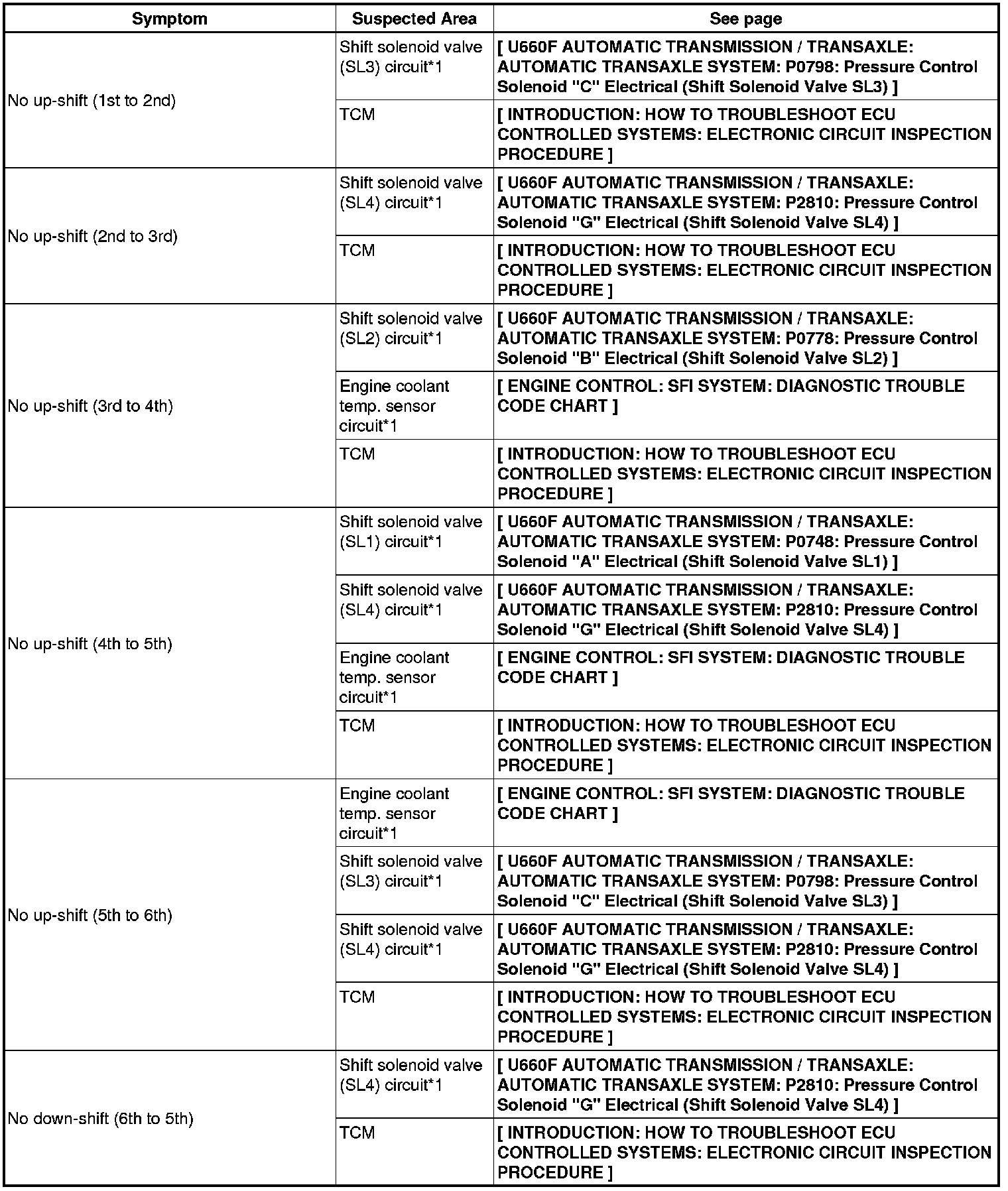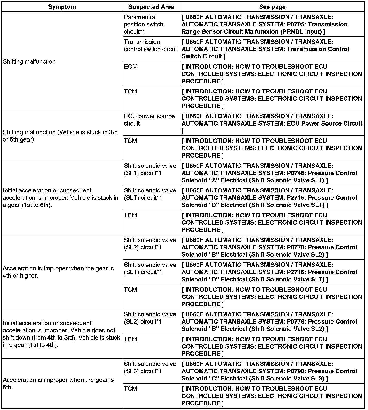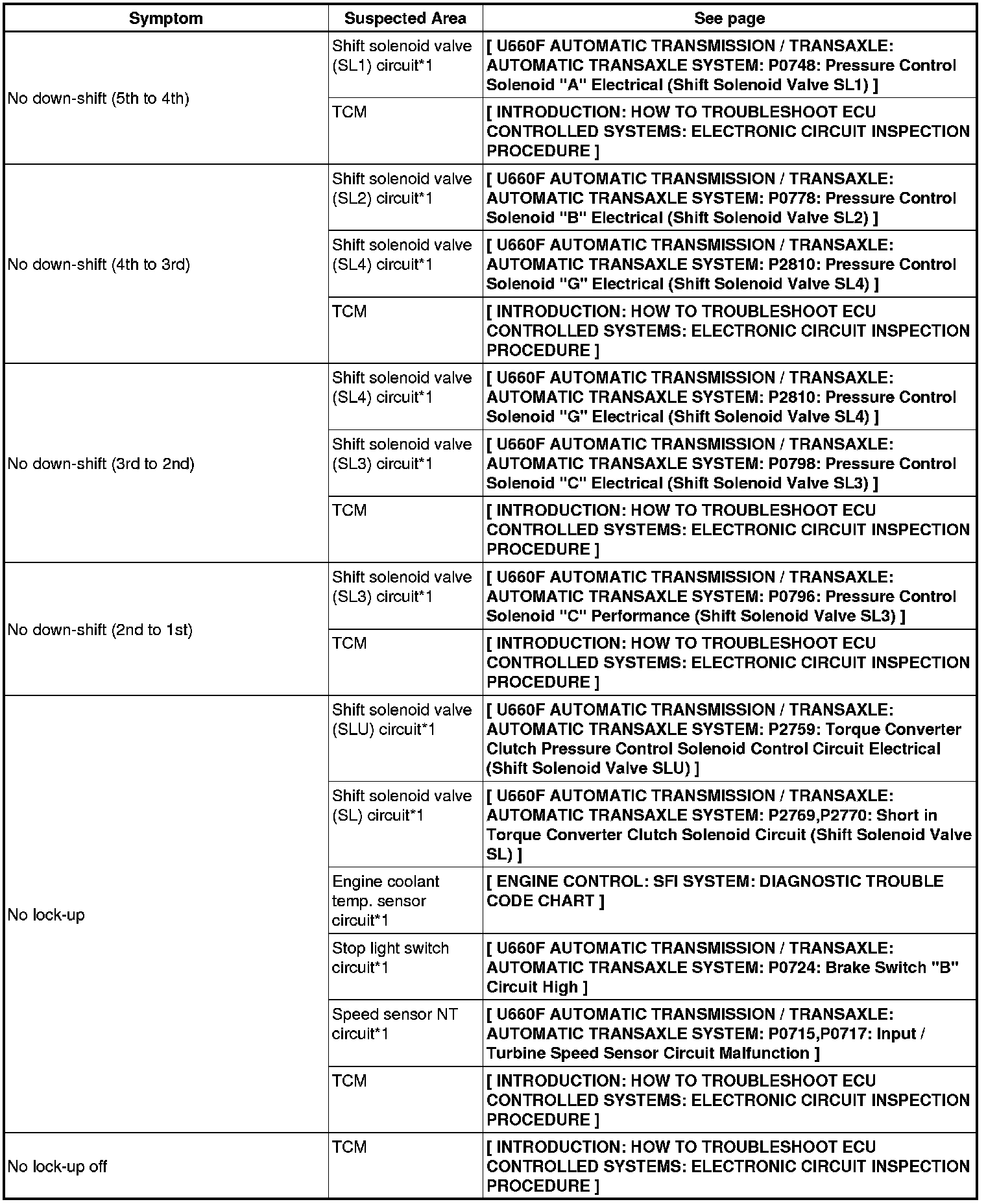 U660F AUTOMATIC TRANSMISSION / TRANSAXLE: AUTOMATIC TRANSAXLE SYSTEM: PROBLEM SYMPTOMS TABLE