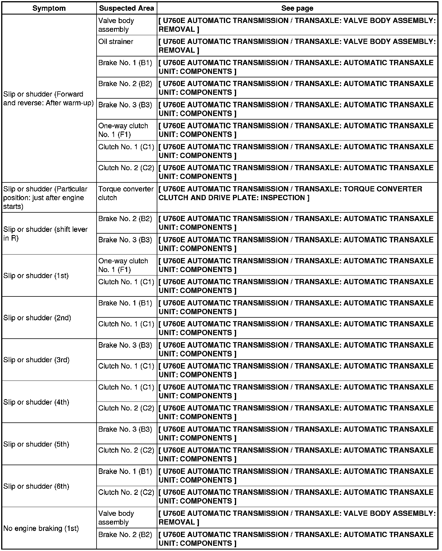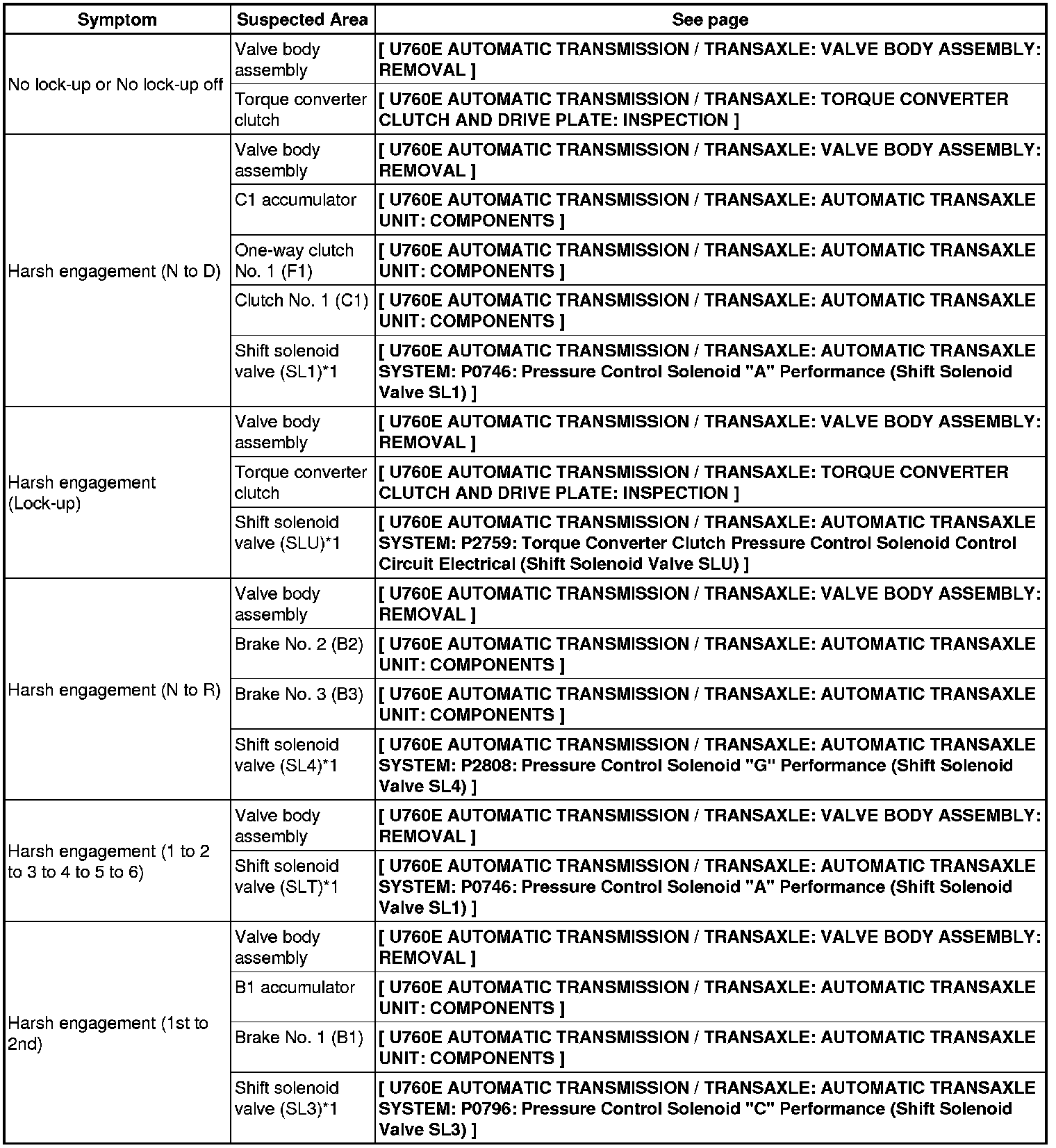 U760E AUTOMATIC TRANSMISSION / TRANSAXLE: AUTOMATIC TRANSAXLE SYSTEM: PROBLEM SYMPTOMS TABLE