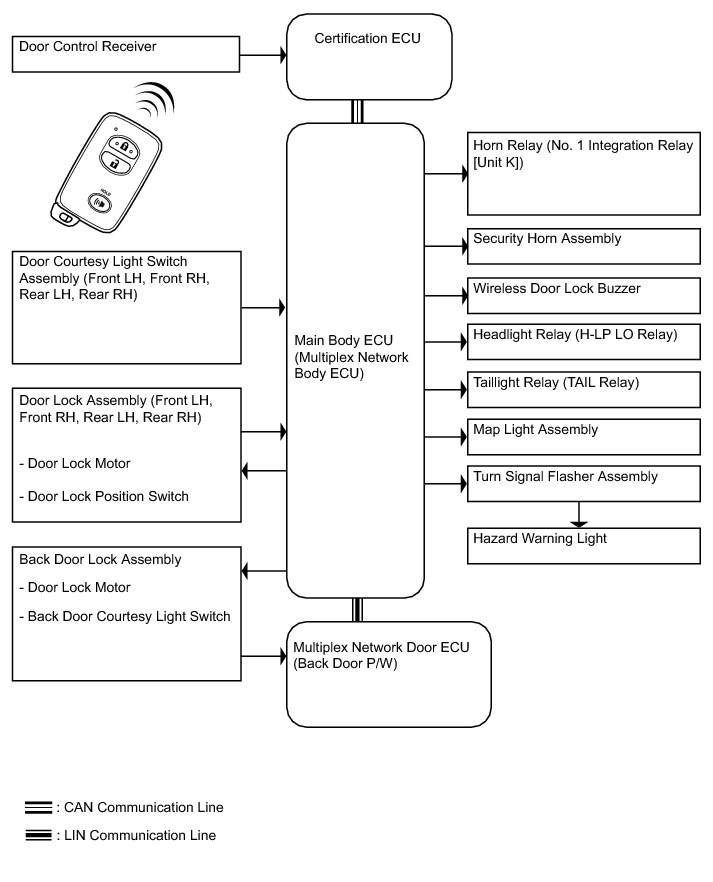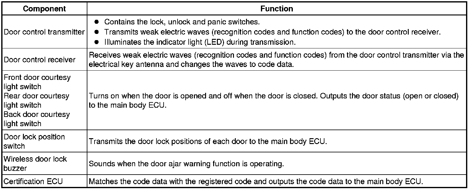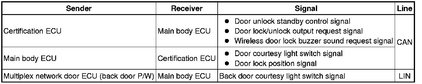The certification ECU performs the code identification process and the main body ECU controls the door locks. A serial data link is provided for communication between the certification ECU and main body ECU.