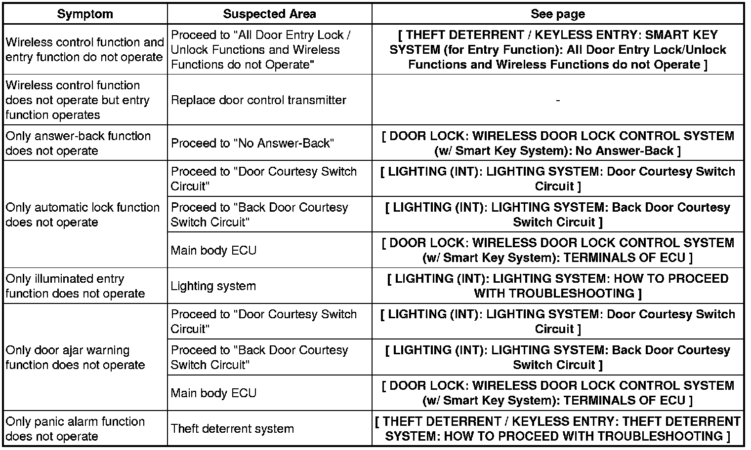 DOOR LOCK: WIRELESS DOOR LOCK CONTROL SYSTEM (w/ Smart Key System): PROBLEM SYMPTOMS TABLE