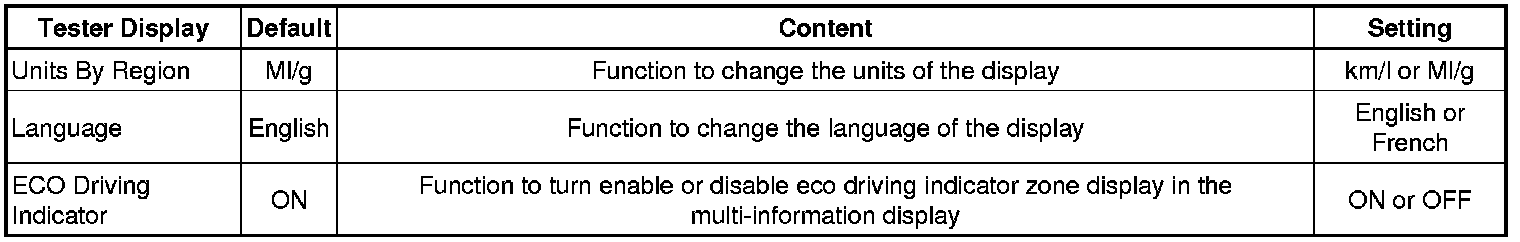 After setting the language to French in the customize parameters, if the ignition switch is ACC, the language displayed on the combination meter assembly changes to French, but the language displayed on the accessory meter assembly is English. If the ignition switch is turned to ON, the language displayed on the accessory meter assembly also changes to French. This phenomenon occurs because communication between the combination meter assembly and accessory meter assembly does begin until the ignition switch is turned to ON. This is not a malfunction.
