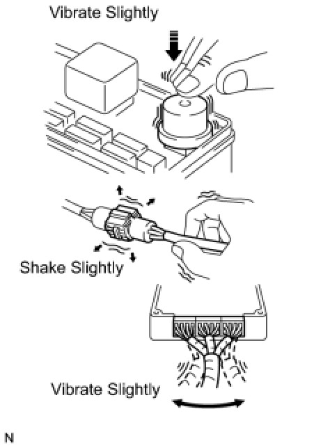 With a problem that only occurs when the engine is cold or as a result of vibration caused by the road during driving, the problem can never be determined if the symptoms are being checked on a stationary vehicle or on a vehicle with a warmed-up engine. Vibration, heat or water penetration (moisture) is difficult to reproduce. The symptom simulation tests below are effective substitutes for the conditions and can be applied on a stationary vehicle.