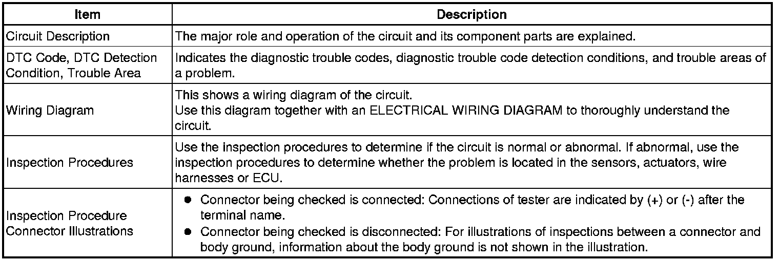 When a "Normal" code is output during a DTC check but the problem is still occurring, use the Problem Symptoms Table. The suspected areas (circuits or parts) for each problem symptom are in the table. The suspected areas are listed in order of probability. A description of each column of the chart is below.