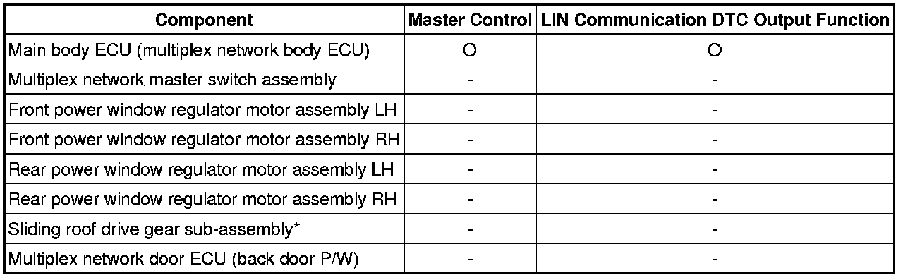 The LIN communication system is used for communication between the components in the tables below. If communication cannot be performed through LIN communication because of a break in the communication lines or some other reason, the master control ECU of the relevant system stores DTCs. Refer to the table below about the communication bus lines and connected components.