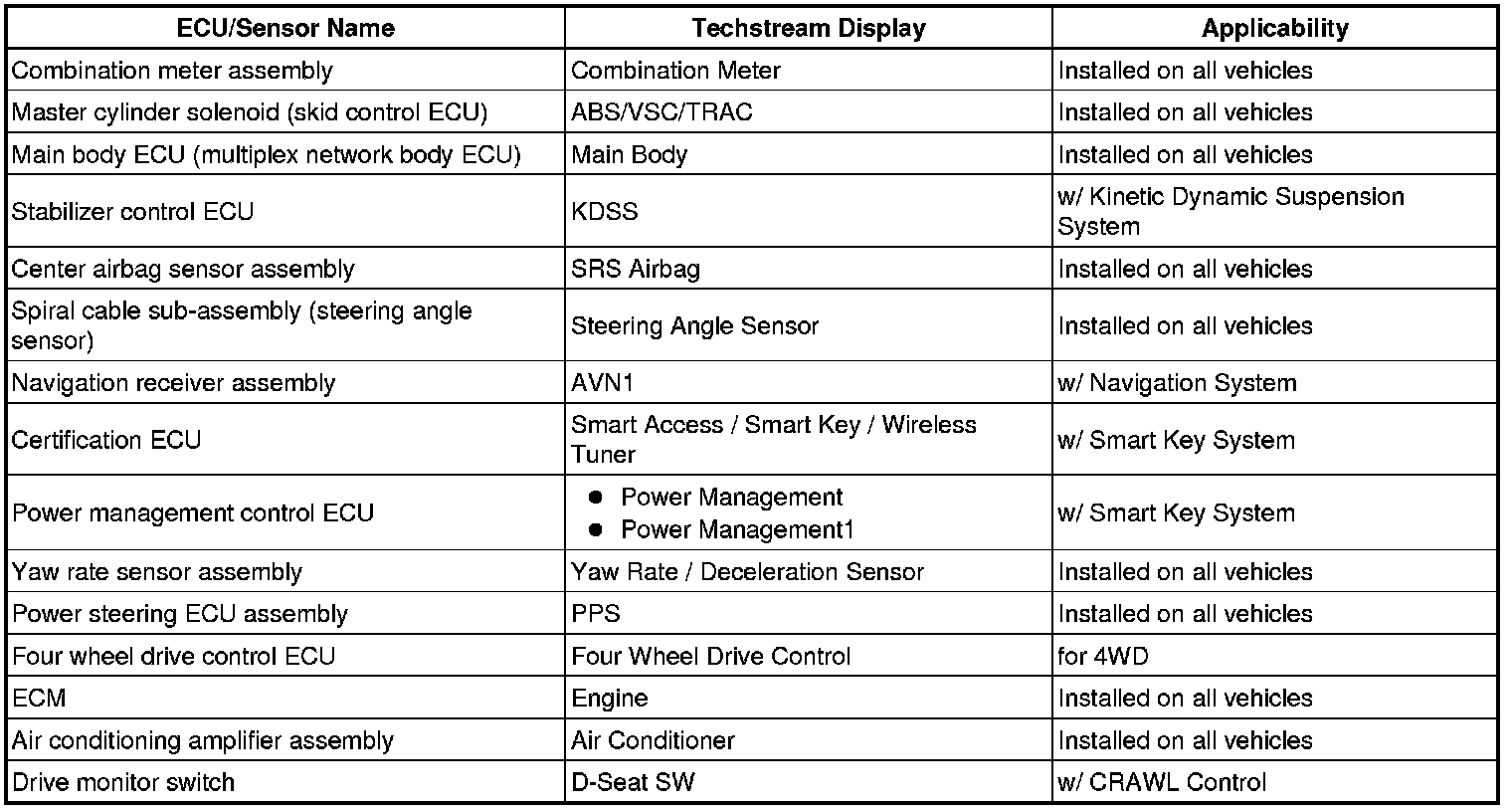 The ECUs and sensors that are properly connected to the CAN communication system can be displayed using the Techstream.