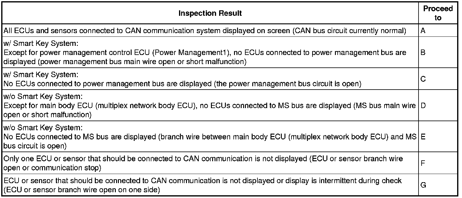 * When checking "CAN Bus Check", ECUs (sensors) whose branch line is open or that cannot communicate via CAN communication do not respond to the Techstream (they are not displayed on the screen).