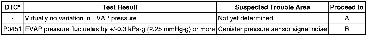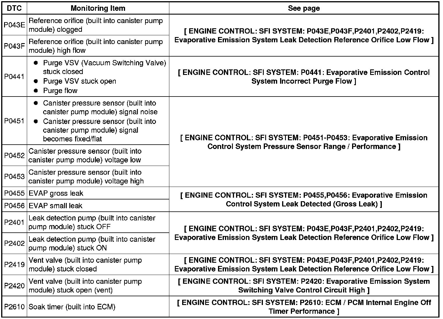If any EVAP system DTCs are output, the malfunctioning area can be determined using the table below.