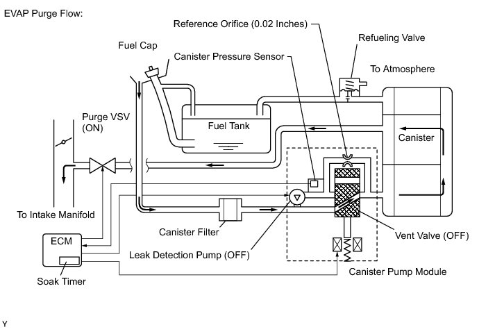 While the engine is running and the purge VSV (Vacuum Switching Valve) is ON (open), the ECM monitors the purge flow by measuring the EVAP pressure change. If negative pressure is not created, the ECM begins the 2nd monitor.