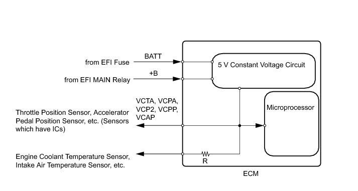 The ECM constantly generates a 5 V power supply voltage from the battery voltage supplied to the +B (BATT) terminal to operate the microprocessor. The ECM also provides this power source voltage to the sensors through the VC output circuit.