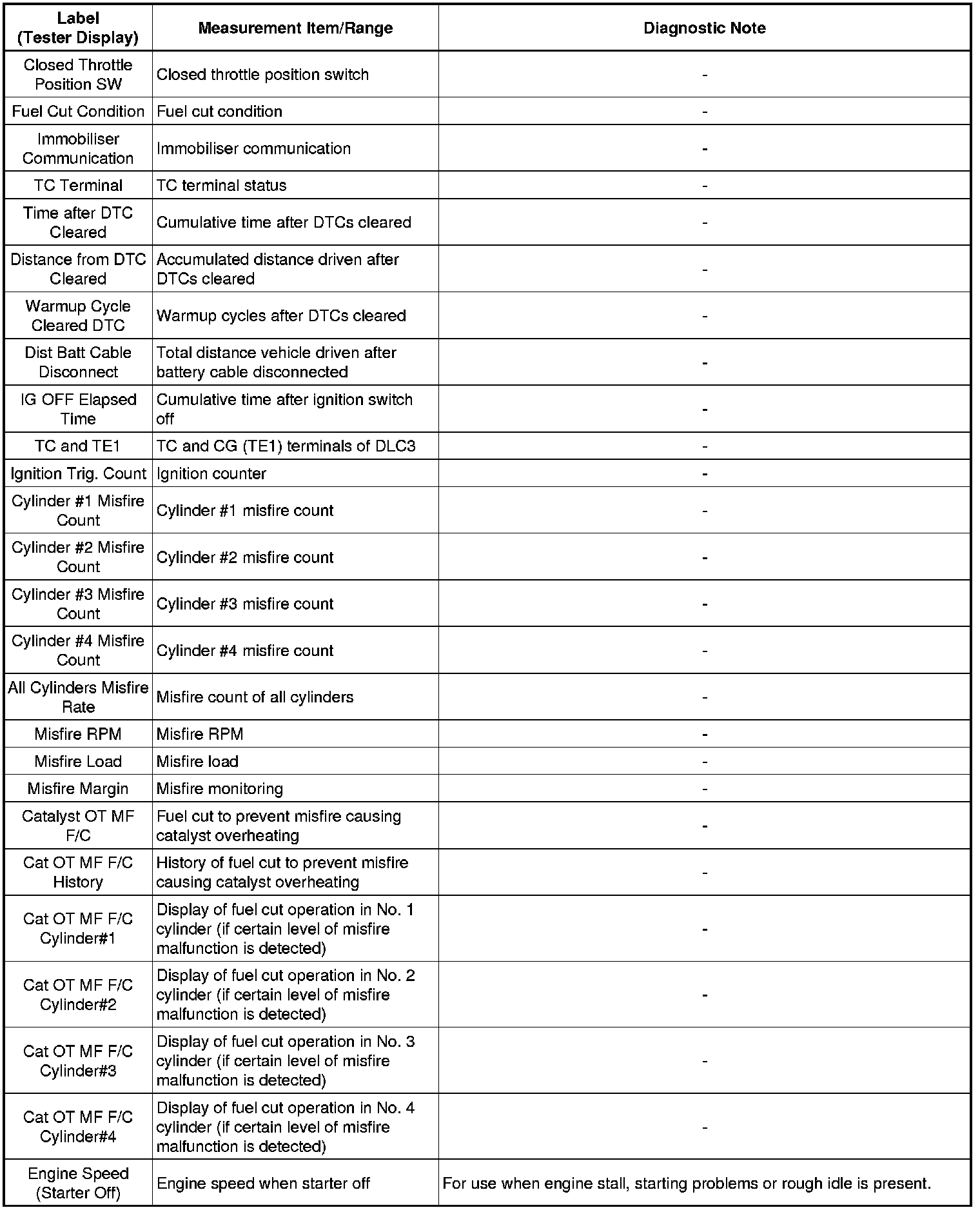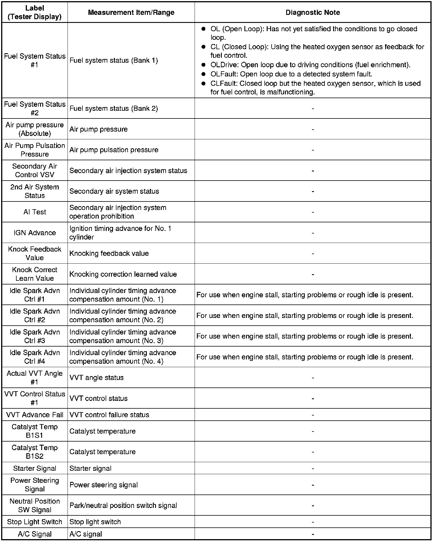 Freeze frame data records the engine conditions (fuel system information, calculated load, engine coolant temperature, fuel trim, engine speed, vehicle speed, etc.) when a malfunction is detected. When troubleshooting, it can help determine if the vehicle was moving or stationary, if the engine was warmed up or not, if the air-fuel ratio was Lean or Rich, and other data from the time the malfunction occurred.