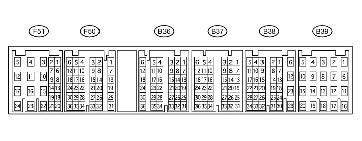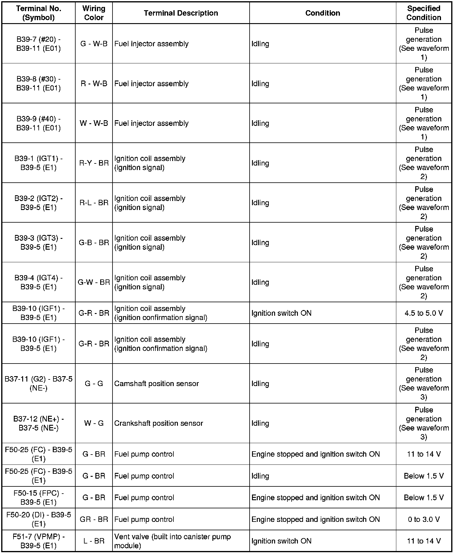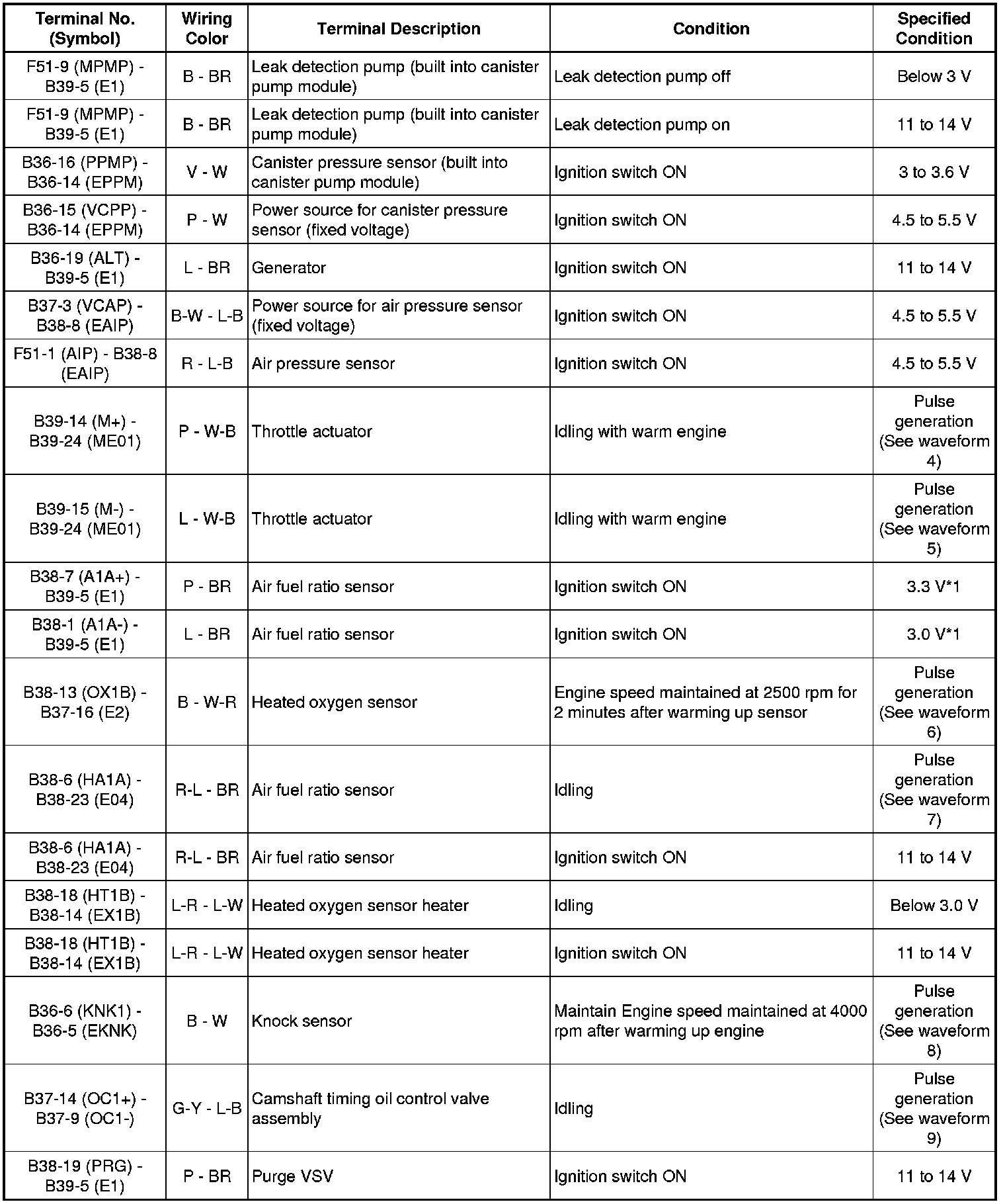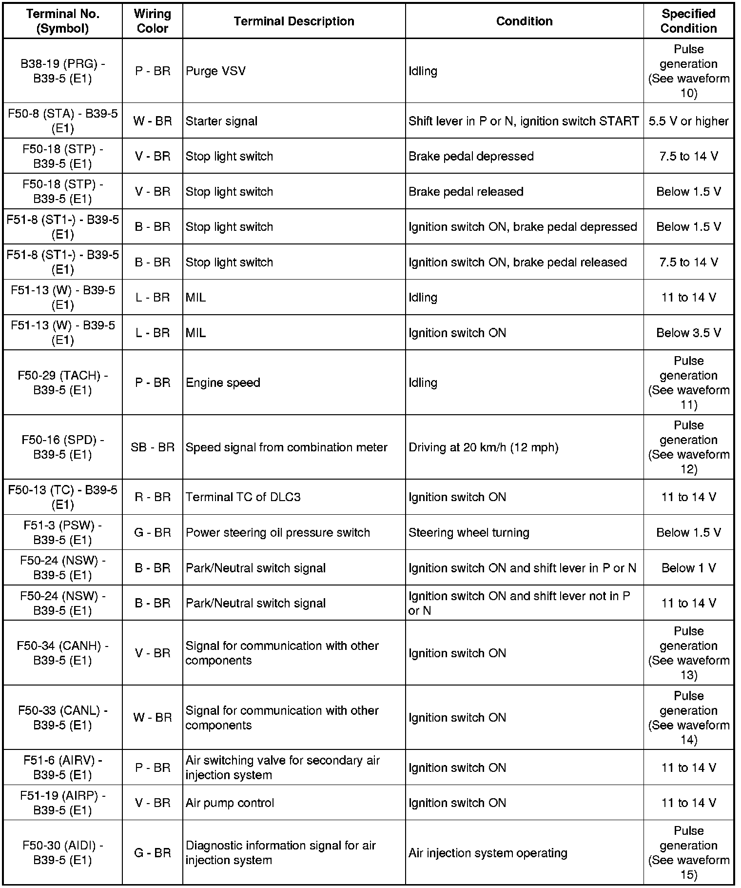 The standard voltage between each pair of ECM terminals is shown in the table below. The appropriate conditions for checking each pair of terminals are also indicated. The result of checks should be compared with the standard voltage for that pair of terminals displayed in the "Specified Condition" column. The illustration above can be used as a reference to identify the ECM terminal locations.