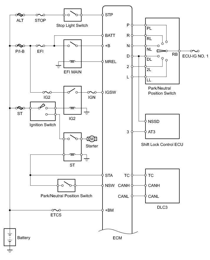 The configuration of the electronic control system for the A343E automatic transmission is as shown in the following chart.