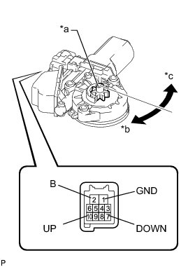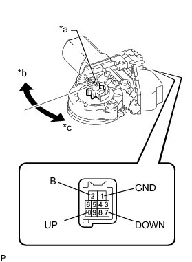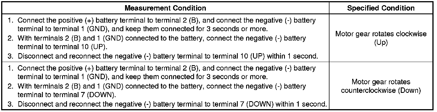 If the result is not as specified, replace the front power window regulator motor assembly.