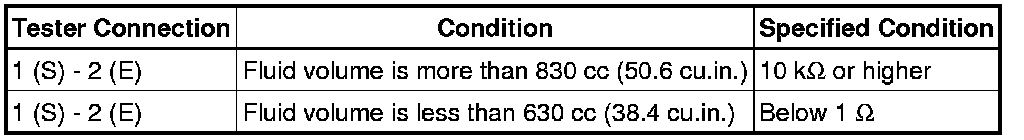 When the fluid volume is between 630 and 830 cc (38.4 cu.in. and 50.6 cu.in.), the level warning switch may be on or off.