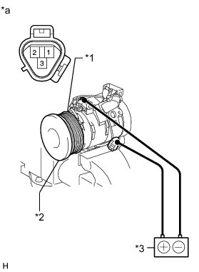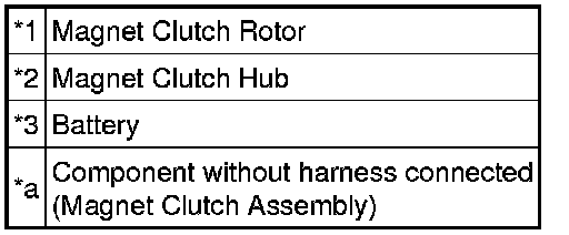 (1) Confirm that the magnet clutch hub and magnet clutch rotor lock when the positive (+) lead of the battery is connected to terminal 3 of the magnet clutch, and the negative (-) lead is connected to the ground wire.