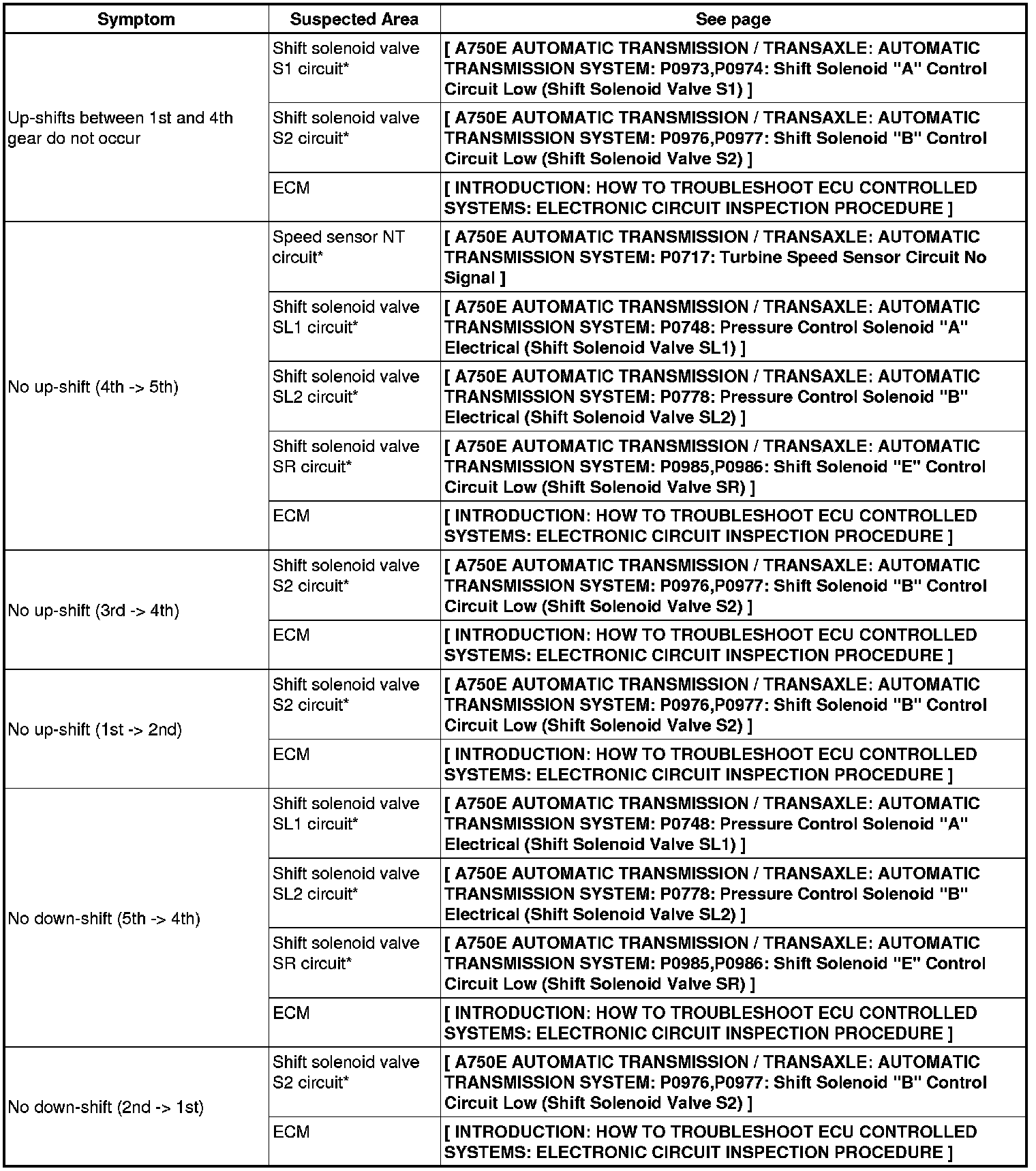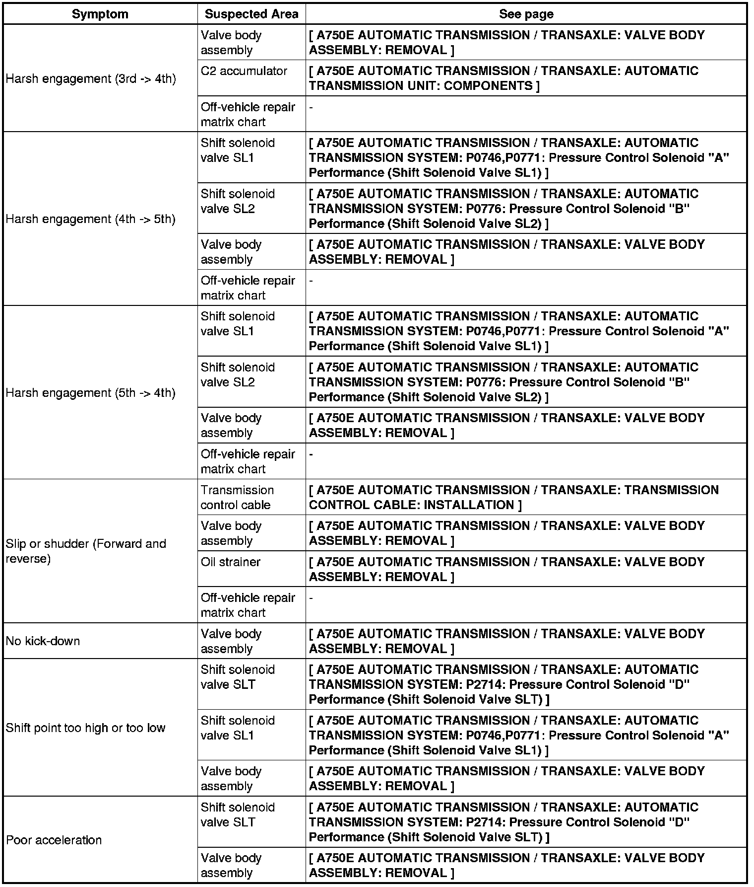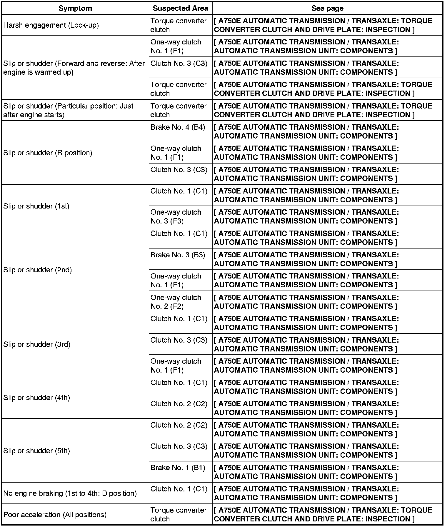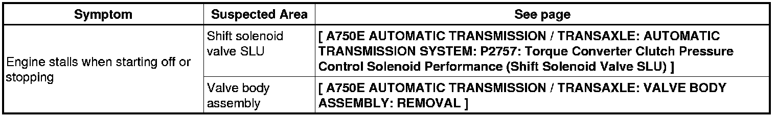A750E AUTOMATIC TRANSMISSION / TRANSAXLE: AUTOMATIC TRANSMISSION SYSTEM: PROBLEM SYMPTOMS TABLE