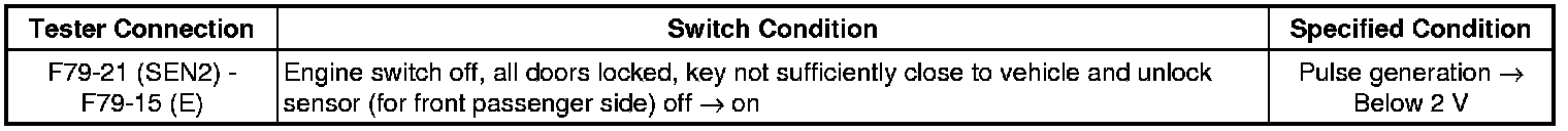 If the front passenger side door entry unlock function does not operate but the entry lock function operates, the communication line between the vehicle and electrical key transmitter is normal. The part at fault may be an unlock sensor circuit (front door outside handle assembly [for front passenger side] -> certification ECU).