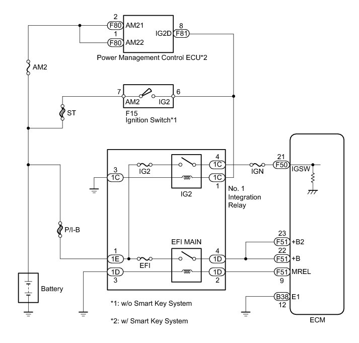 When the ignition switch is turned to ON, the battery voltage is applied to terminal IGSW of the ECM. The output signal from the MREL terminal of the ECM causes a current to flow to the coil of the No. 1 integration relay (EFI MAIN), closing the contacts and supplying power to both terminal +B and +B2 of the ECM.