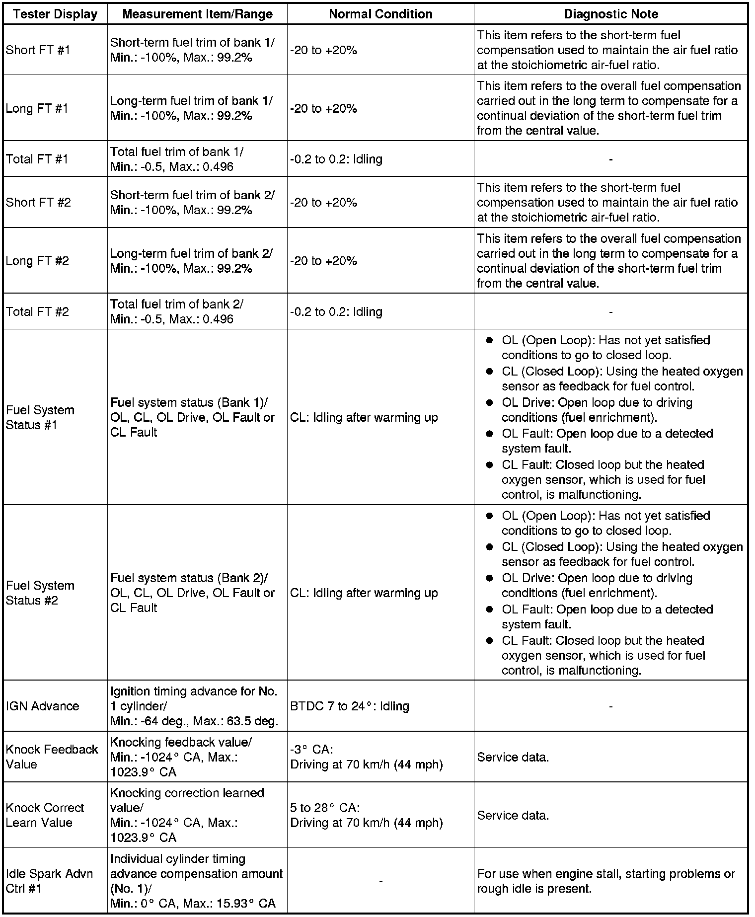 Normal Condition: If no conditions are specifically stated for "idling", the shift lever should be in N or P, the A/C switch should be off and all accessory switches should be off.
