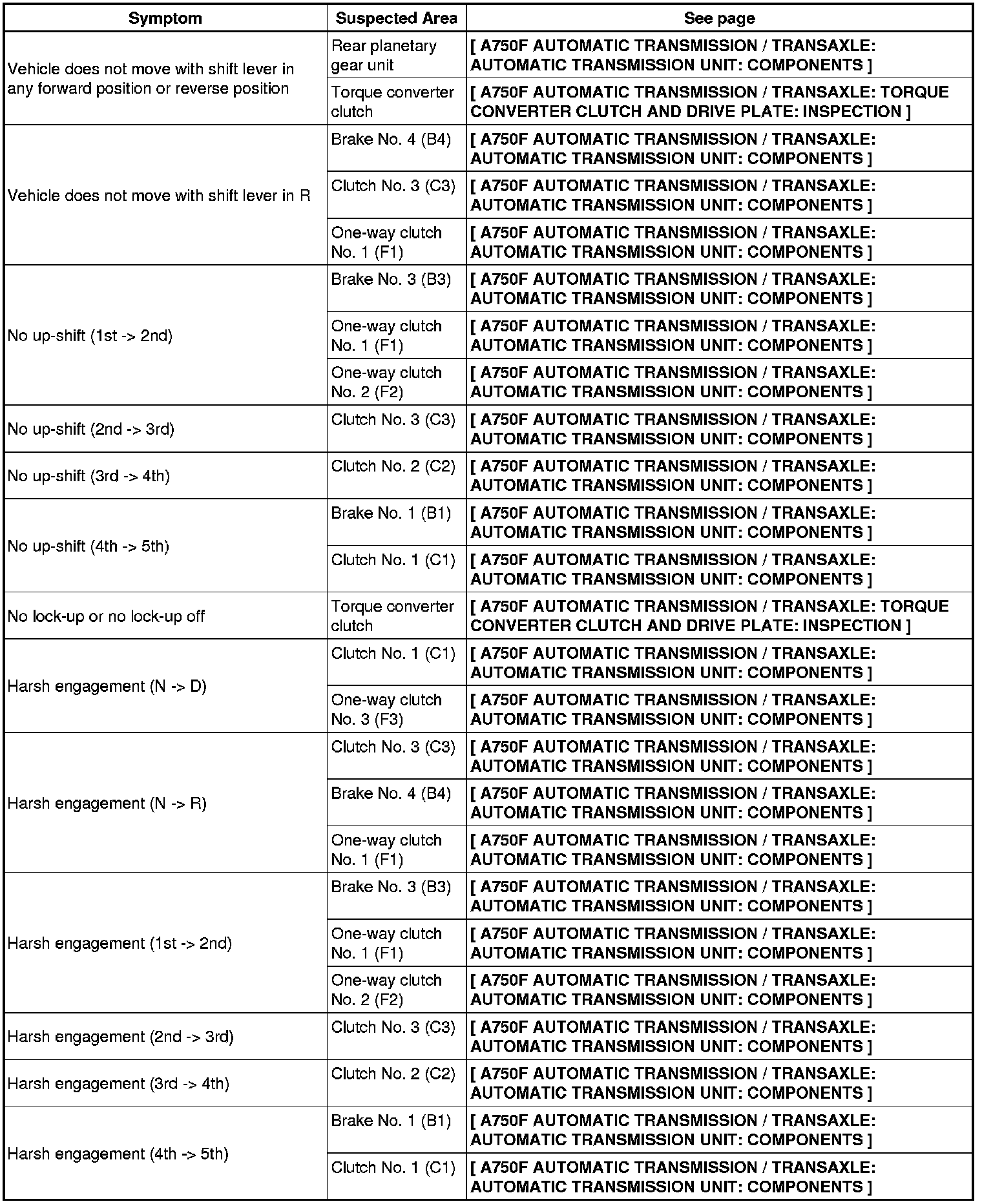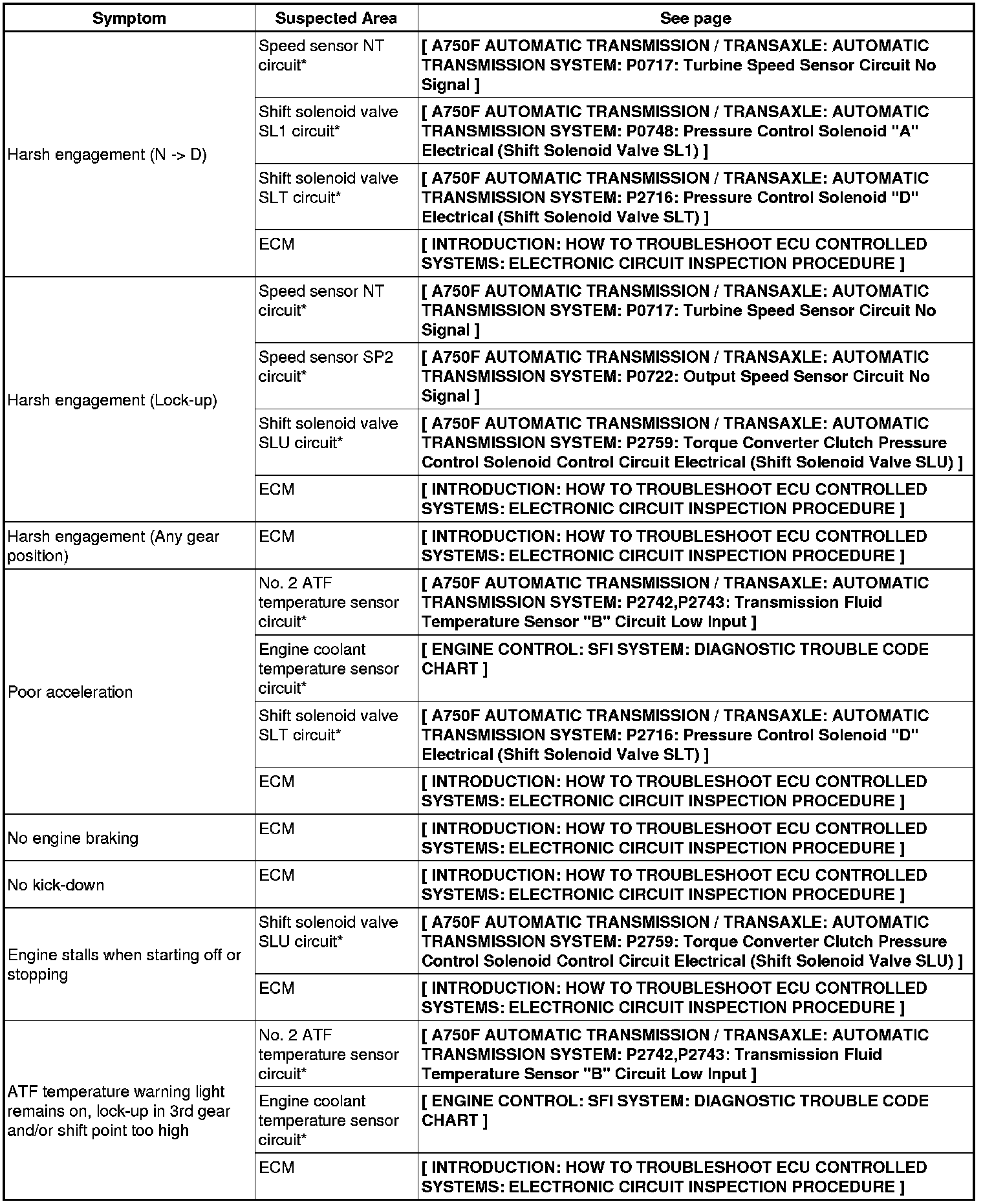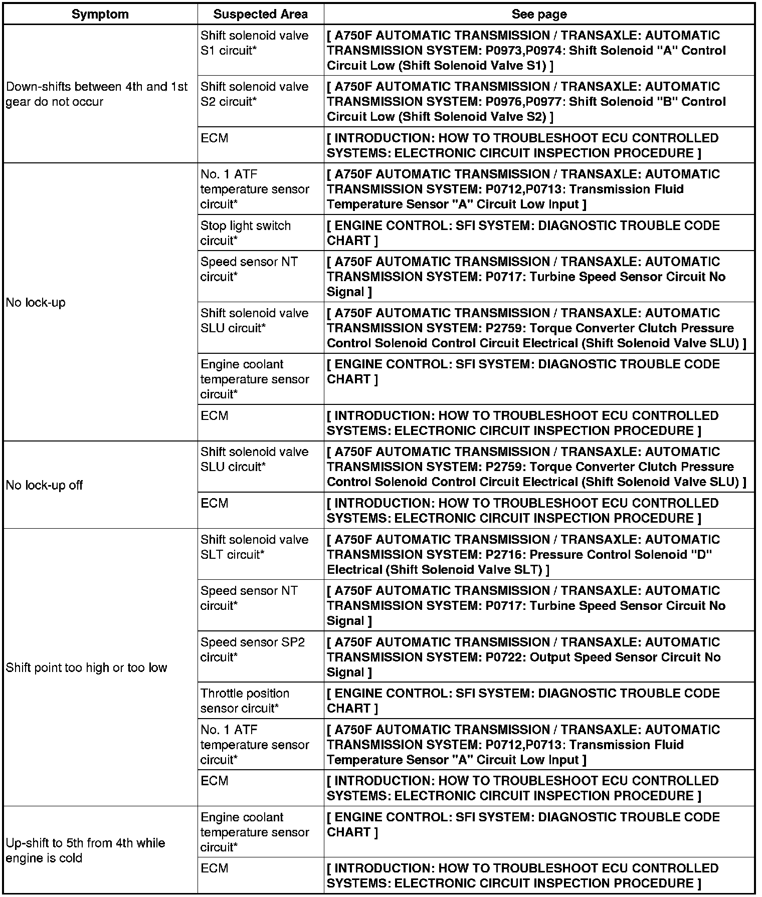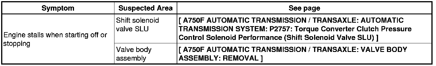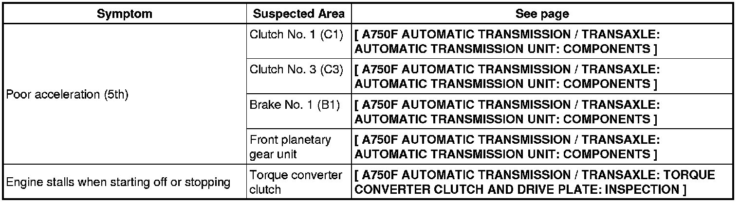 A750F AUTOMATIC TRANSMISSION / TRANSAXLE: AUTOMATIC TRANSMISSION SYSTEM: PROBLEM SYMPTOMS TABLE