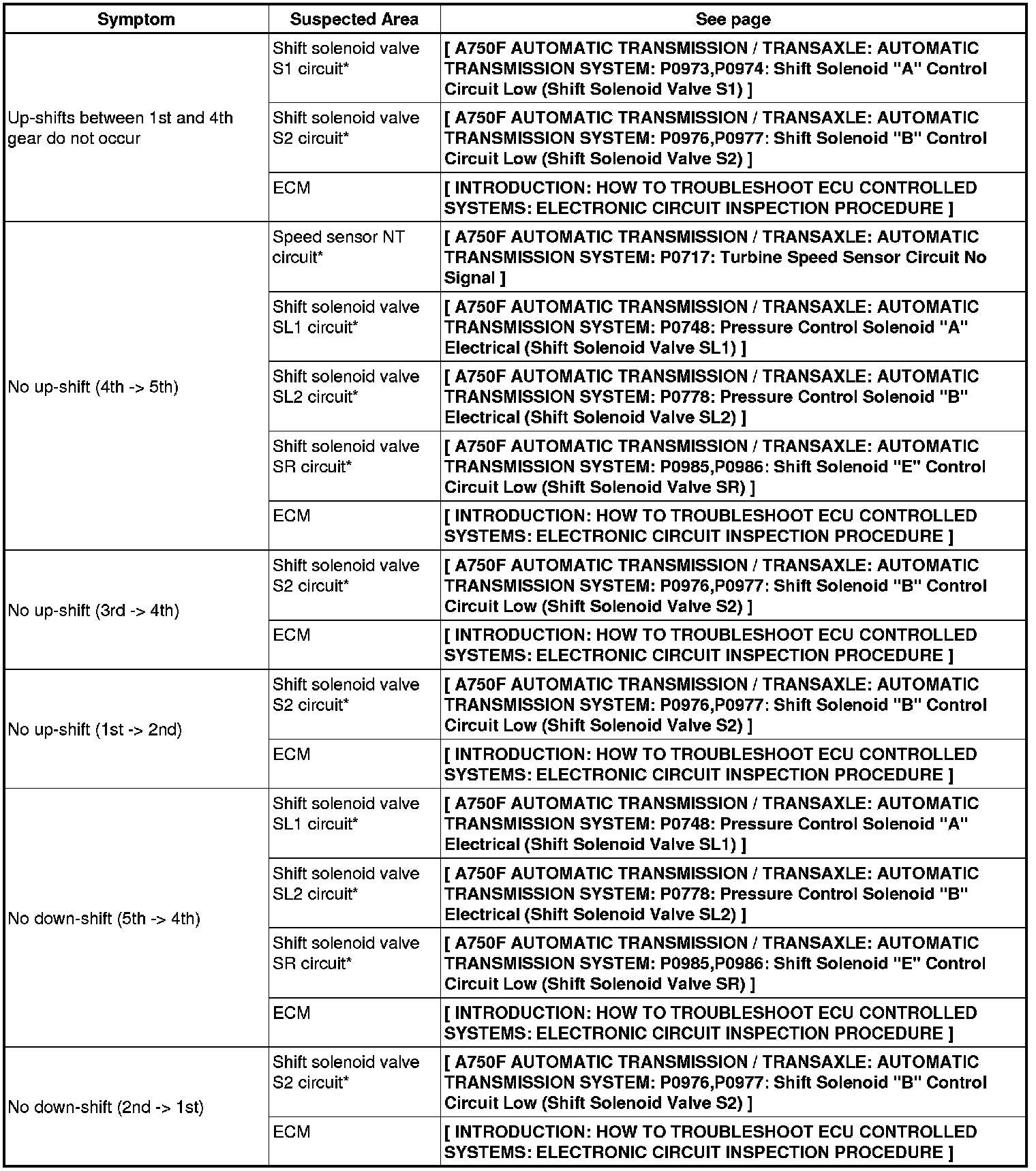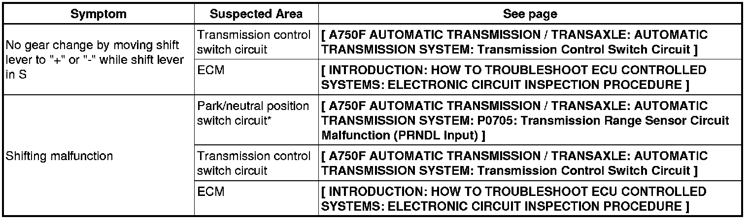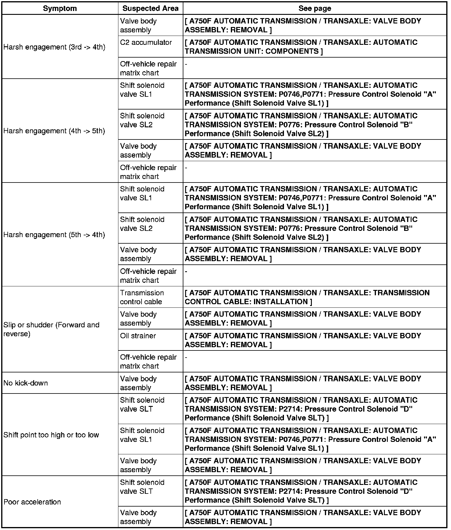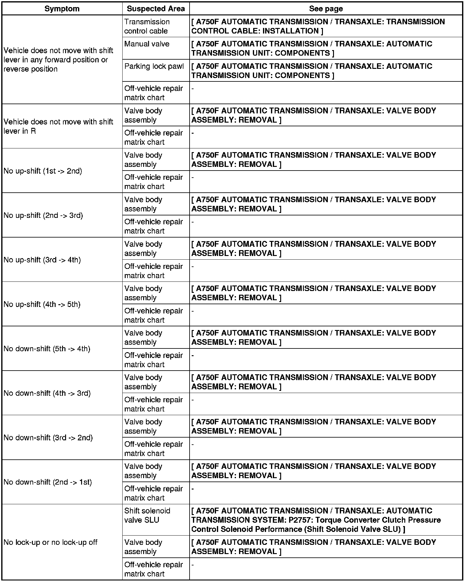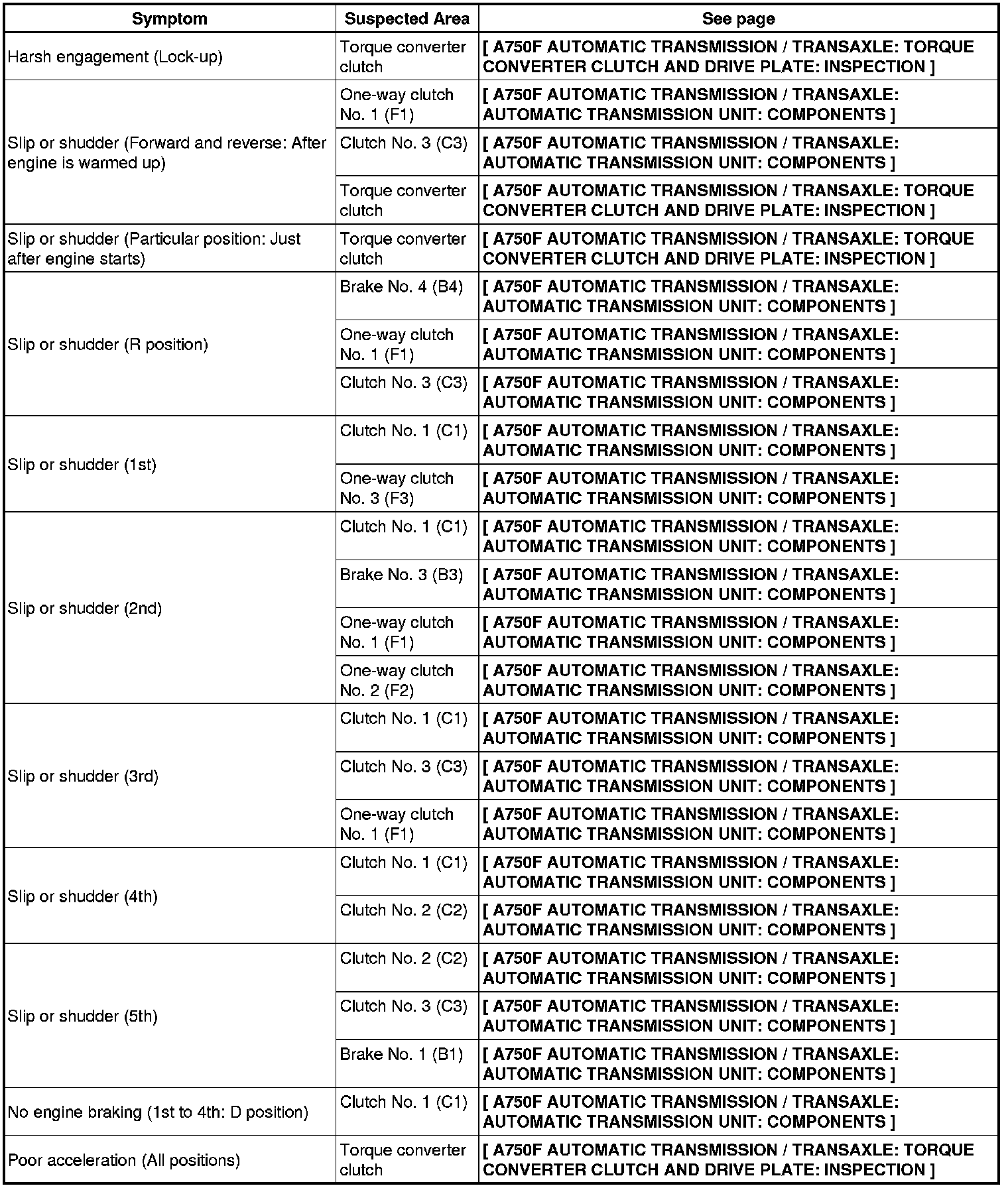 A750F AUTOMATIC TRANSMISSION / TRANSAXLE: AUTOMATIC TRANSMISSION SYSTEM: PROBLEM SYMPTOMS TABLE
