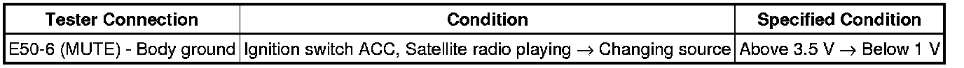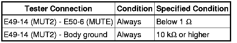 The mute signal is sent to reduce noise and a popping sound generated when switching the mode etc. If there is an open in the circuit, noise can be heard from the speakers when changing the sound source. If there is a short in the circuit, even though the navigation receiver assembly is functioning normally, no sound or only an extremely faint sound can be heard.