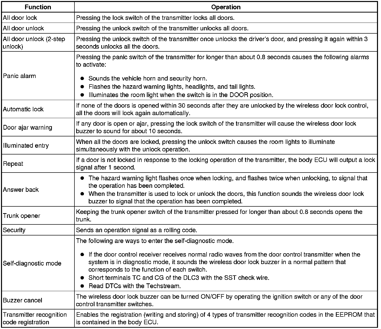 (a) The door control transmitter has lock, unlock, panic and trunk opener switches. Operating these switches activates each function.