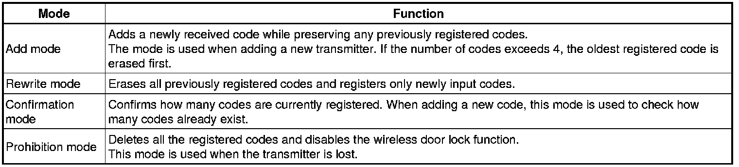 (a) The table below shows the 4 ID registration function modes by which up to 4 different codes can be registered. The codes are electronically registered (written and stored) in the EEPROM that is contained in the multiplex network body ECU.