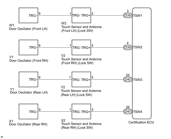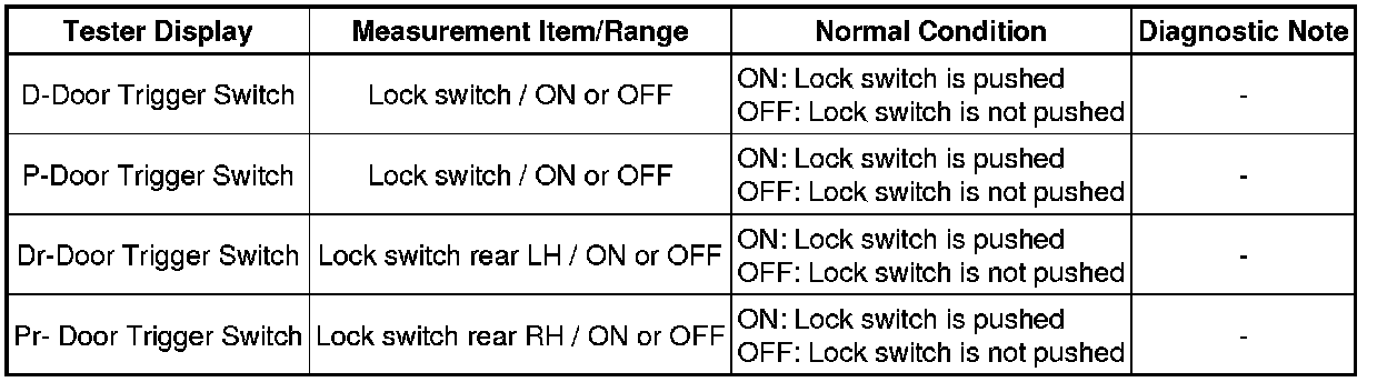 Lock switches (trigger switch) are built into the outside handles of each door. The certification ECU detects the conditions of the each lock switch.