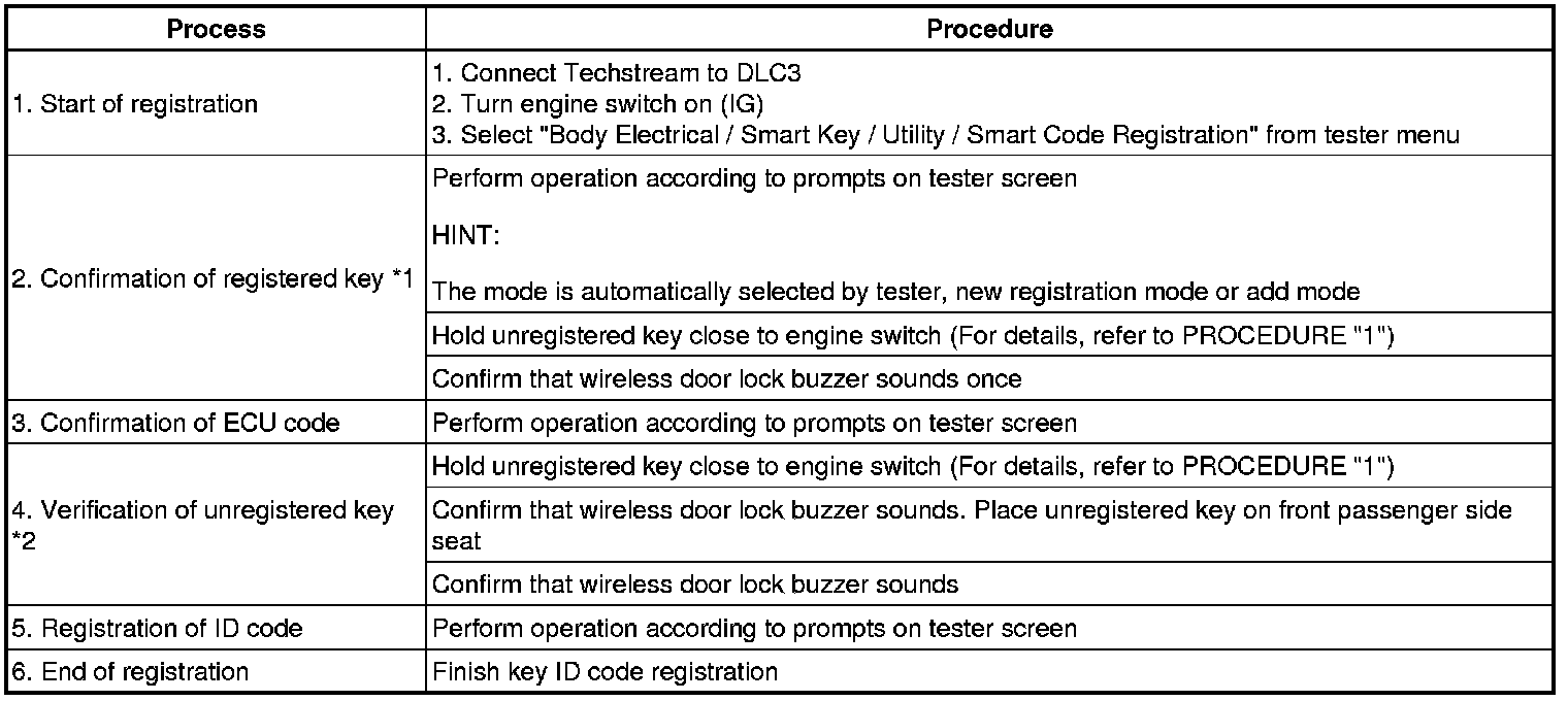 *1: Perform this process for one of the keys registered for the vehicle. Finish the procedure within 30 seconds. If the procedure has not been finished within the specified time, perform registration procedures from process 1 again.