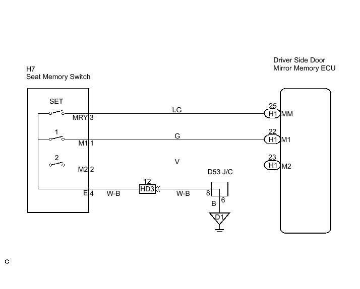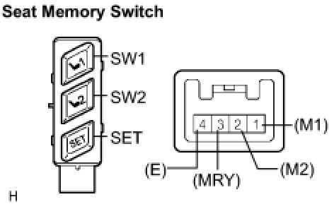 The seat memory switch sends signals to the outer mirror control ECU assembly via the multiplex communication system to memorize a given seat position. This memory system does not use a position sensor. The seat position is detected by counting pulses that are output when the motor turns. If there is no pulse output from the motor, the motor will stop operating. The seat memory switch is later used to send signals to the front power seat switch to return the seat to one of the memorized positions.