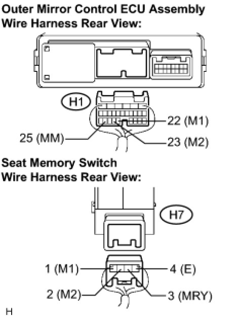 4. CHECK HARNESS AND CONNECTOR (OUTER MIRROR CONTROL ECU ASSEMBLY - SEAT MEMORY SWITCH)