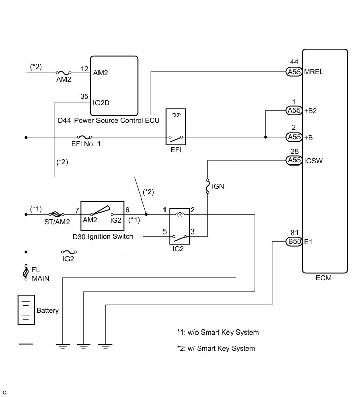 When the ignition switch is turned to ON, the battery voltage is applied to terminal IGSW of the ECM. The ECM MREL output signal causes a current to flow to the coil, closing the contacts of the EFI relay and supplying power to terminal +B and +B2 of the ECM.