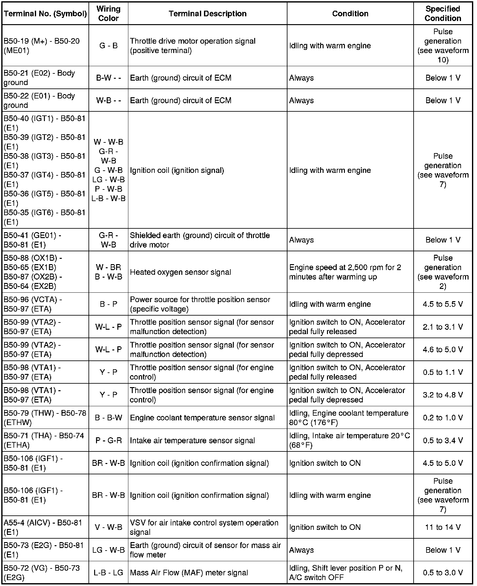 The standard normal voltage between each pair of the ECM terminals is shown in the table below. The appropriate conditions for checking each pair of the terminals are also indicated.
