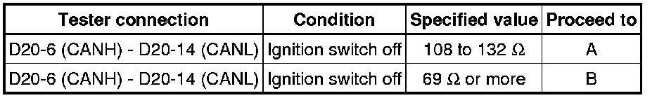 When the measured value is 69 Ohms or more and a CAN communication system DTC is output, there may be a fault besides disconnection of the DLC3 sub bus line. For that reason, troubleshooting should be performed again from "HOW TO PROCEED WITH TROUBLESHOOTING" Initial Inspection and Diagnostic Overview after repairing the trouble area.